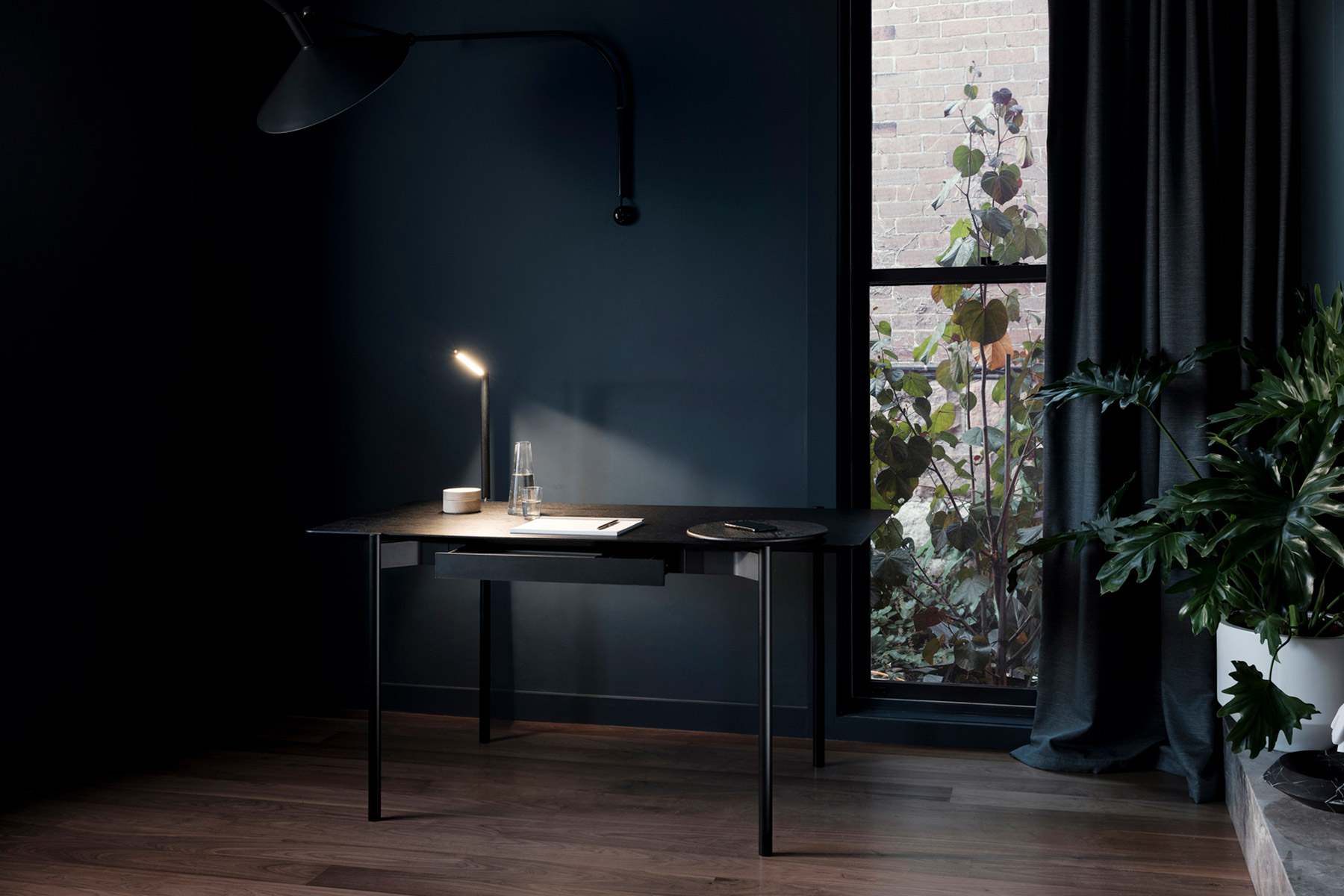 For a home office, Aimee likes the clean lines and integrated technology of the Eto Desk featured here in Onyx.