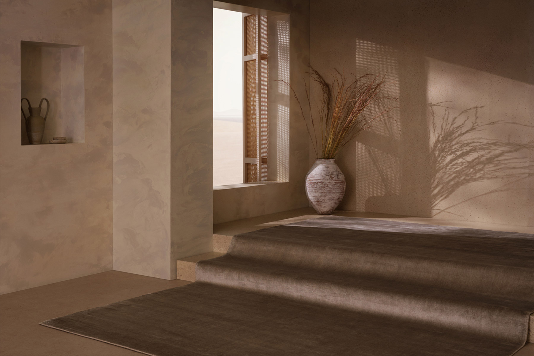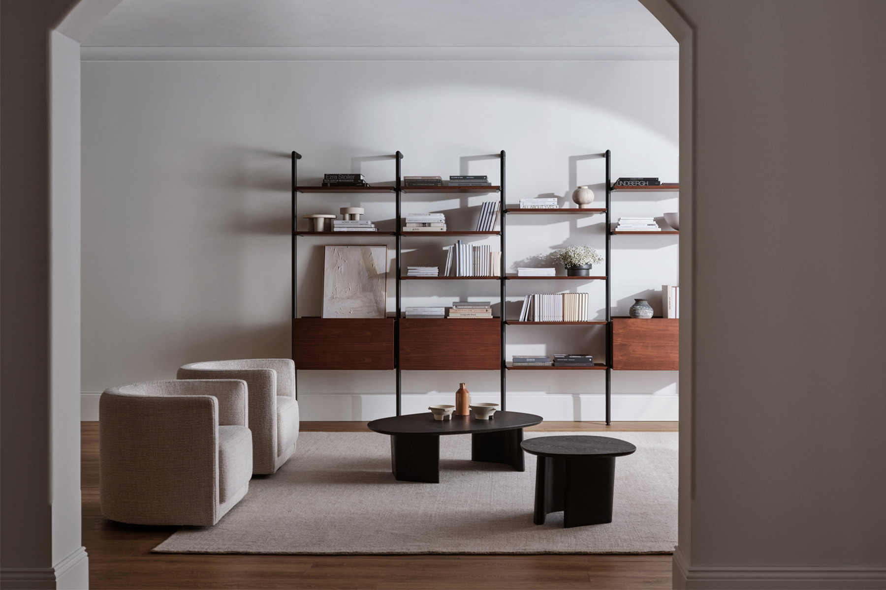 Aimee’s Work From Home mood board uses a transeasonal palette referencing Spring. Textural fabrics like Nolan and Manhattan bring warmth, while the Seymour Chair upholstered in the Preston Velvet adds a sophisticated edge to the space. Rich timber tones in the Eto Desk, Amara Dining Chair and Vertio Wall System contrast against the beautiful Hue Rug in Sage.