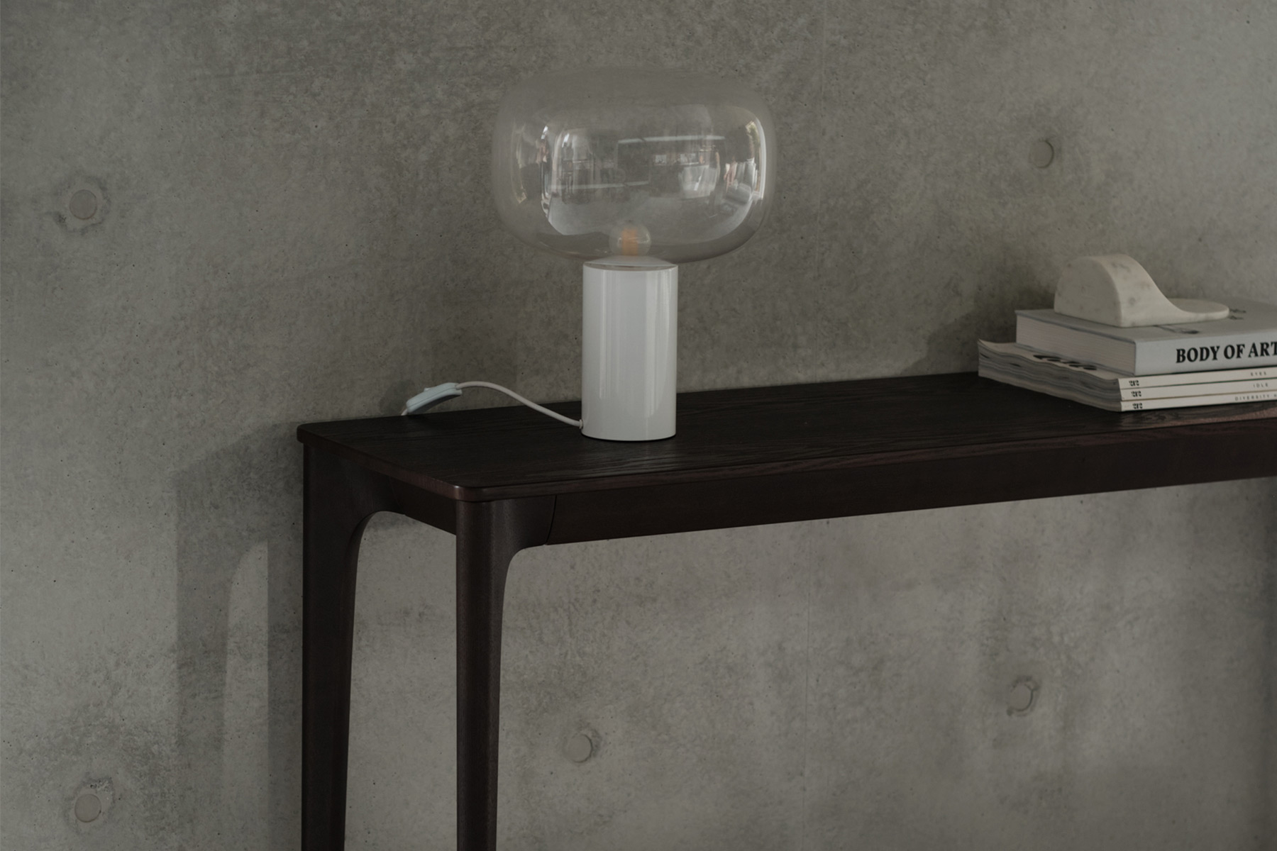 Quay Console Table in Onyx and Pallino Table Lamp in Enamel White.