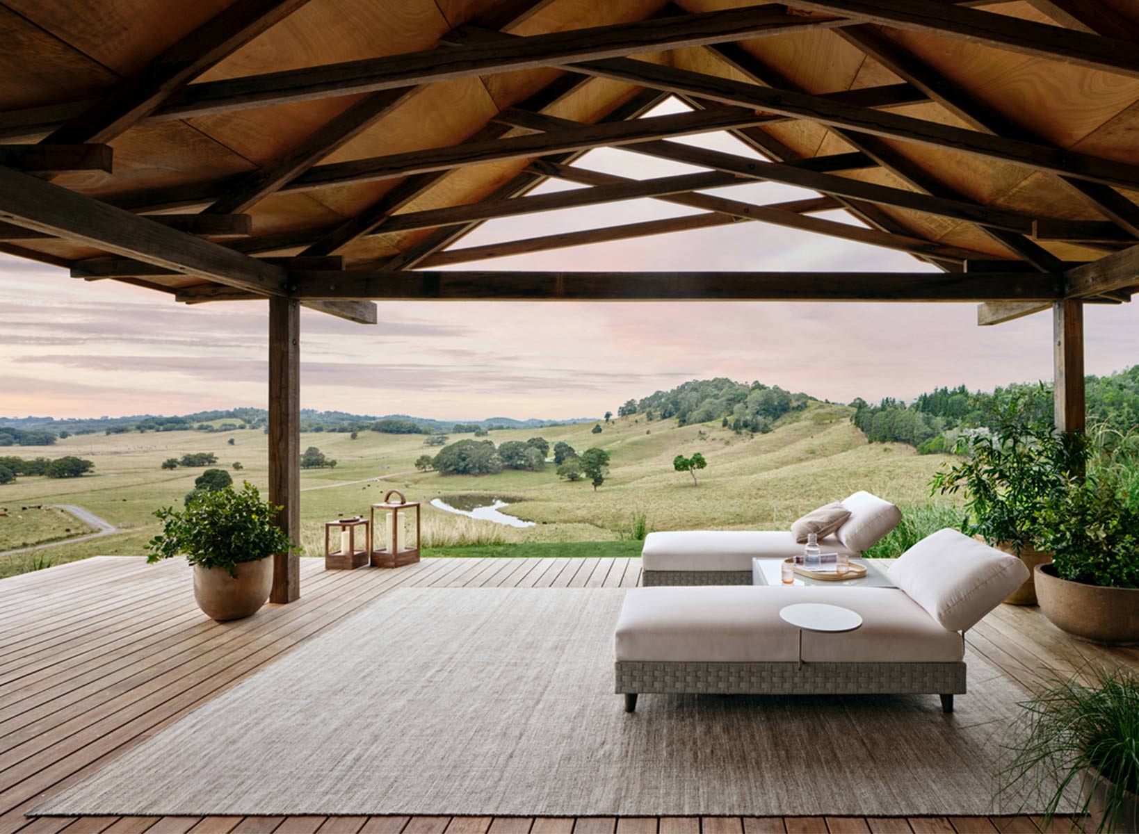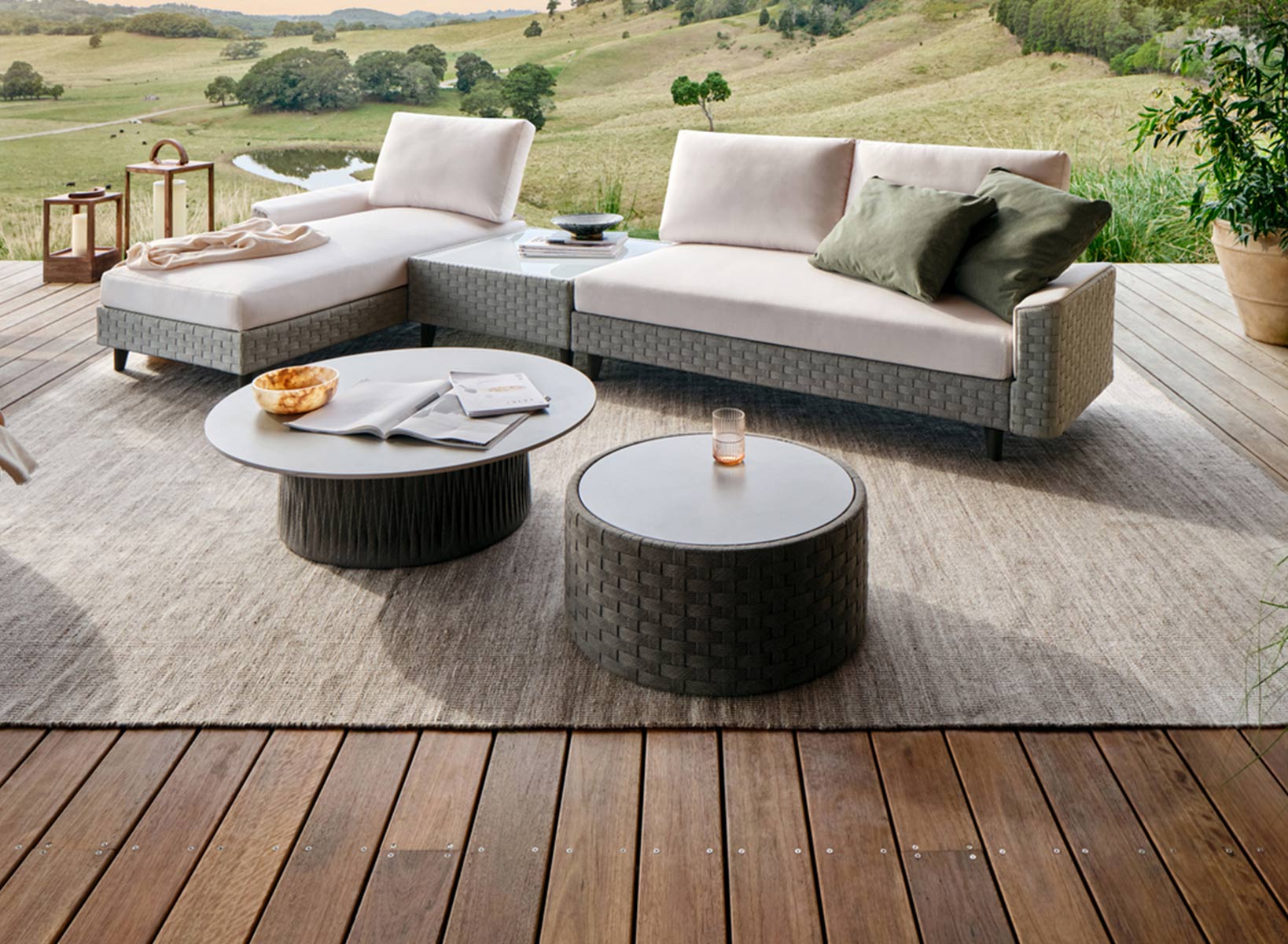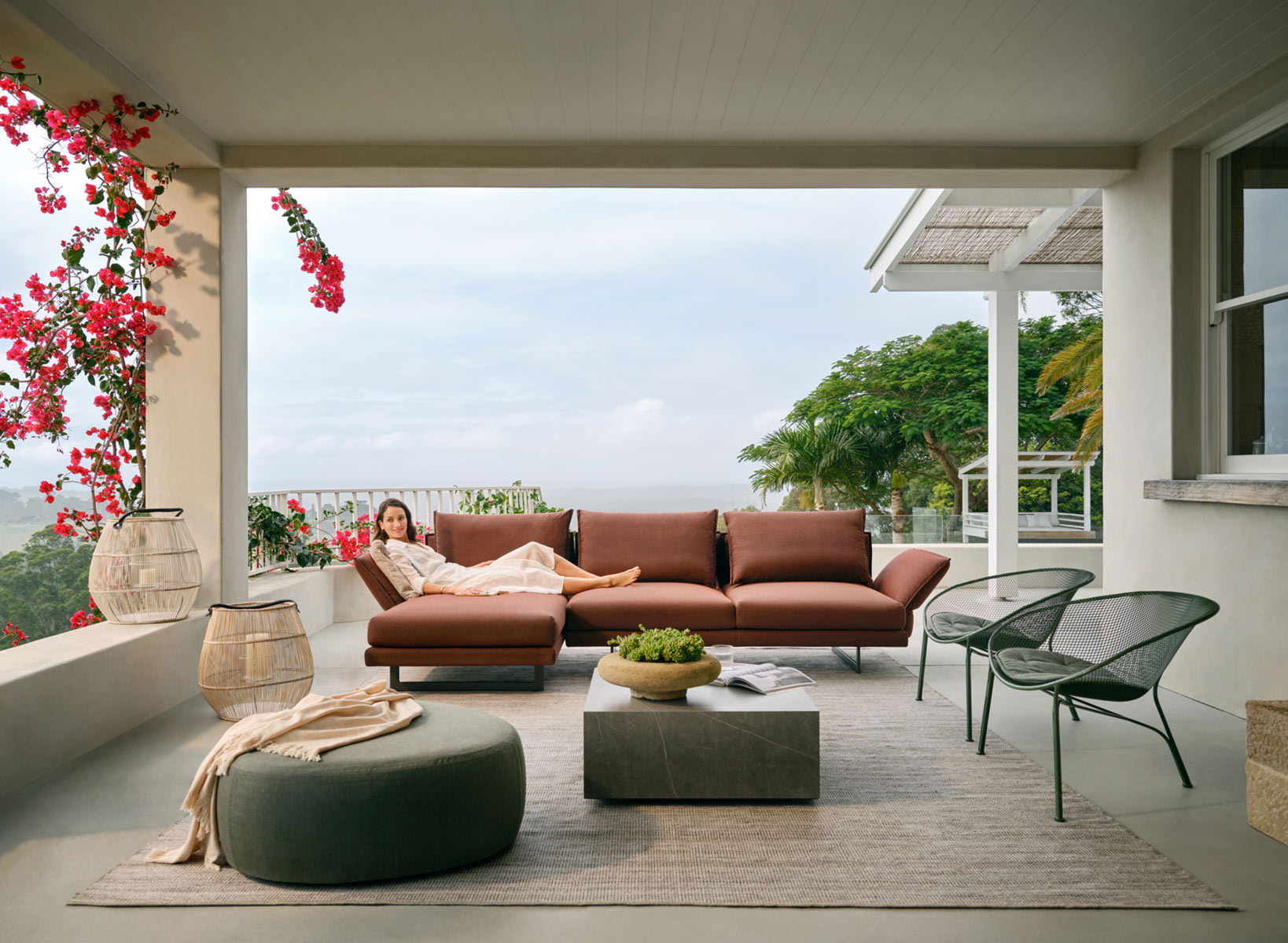 Zaza Outdoor in Malibu Eucalyptus sits on Neale’s verandah along with the Luna Chair in Rock, Oasis Outdoor Inset Tables in Slate and Dusk WeatherWeave® and Avalon Indoor Outdoor Rug.