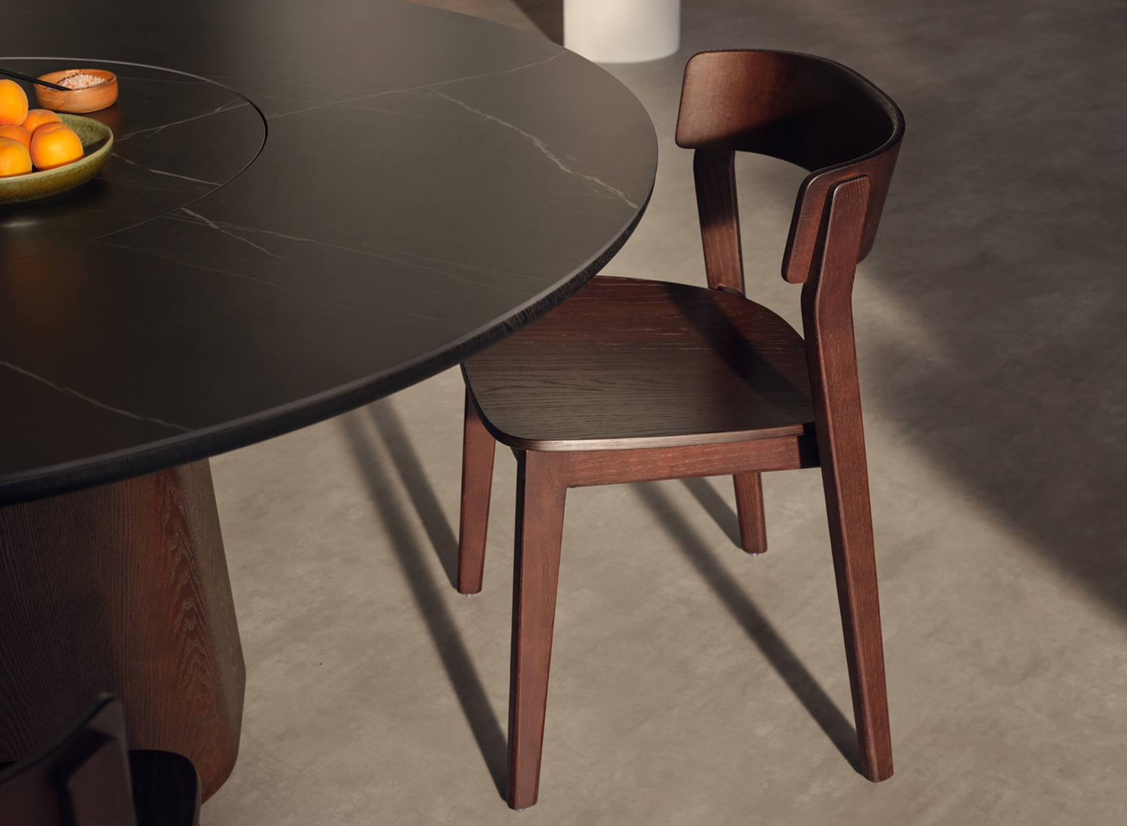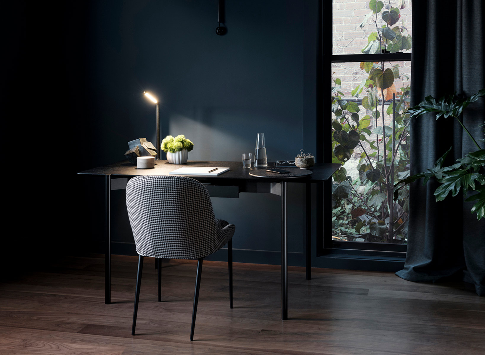 The Eto Desk (left) and Issho Dining Table and Amara Dining chairs complement Neale’s classic pieces and artworks.