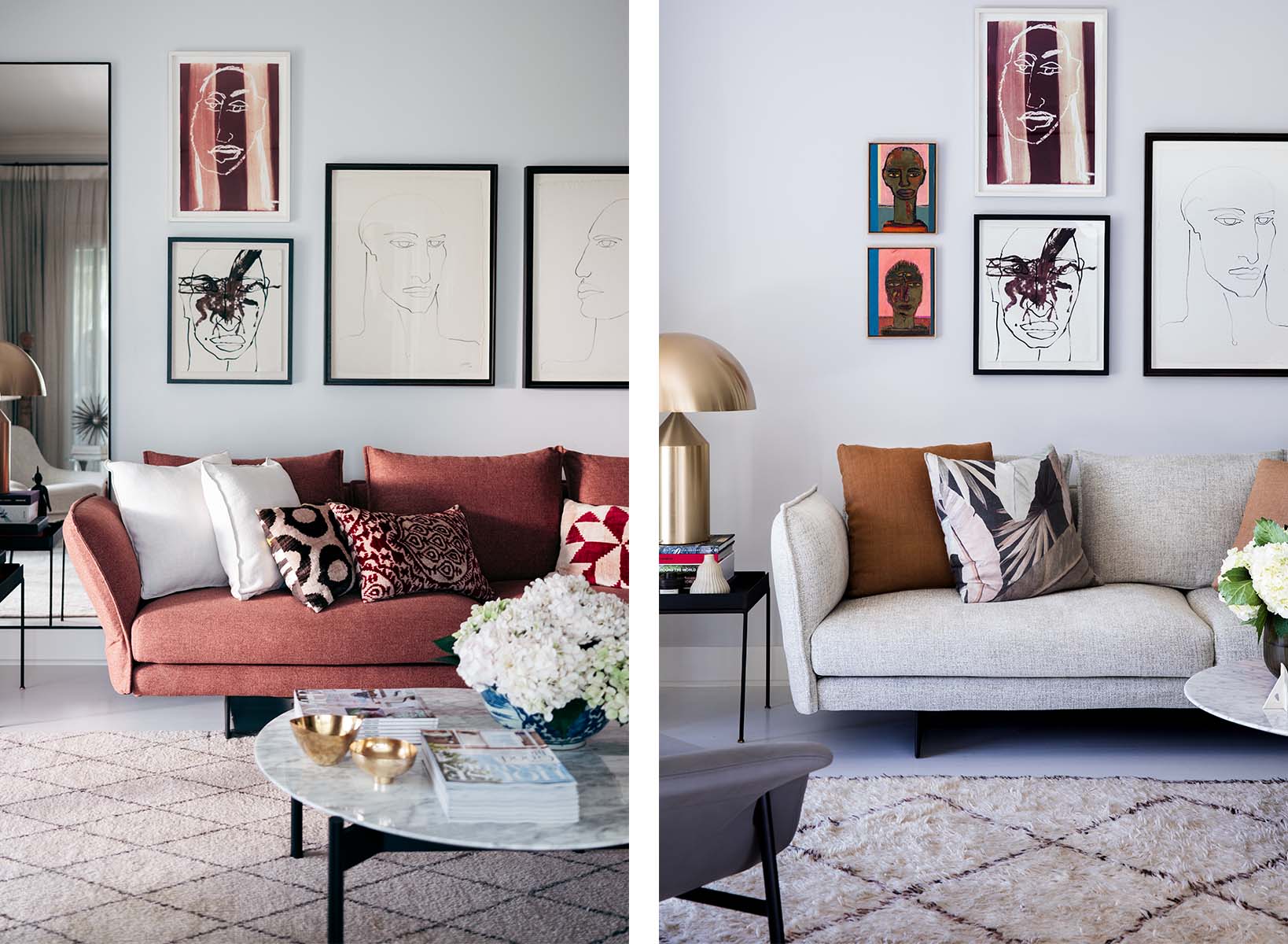 Neale’s beloved Zaza before and after, refreshed with removable covers in Bronte Natural.