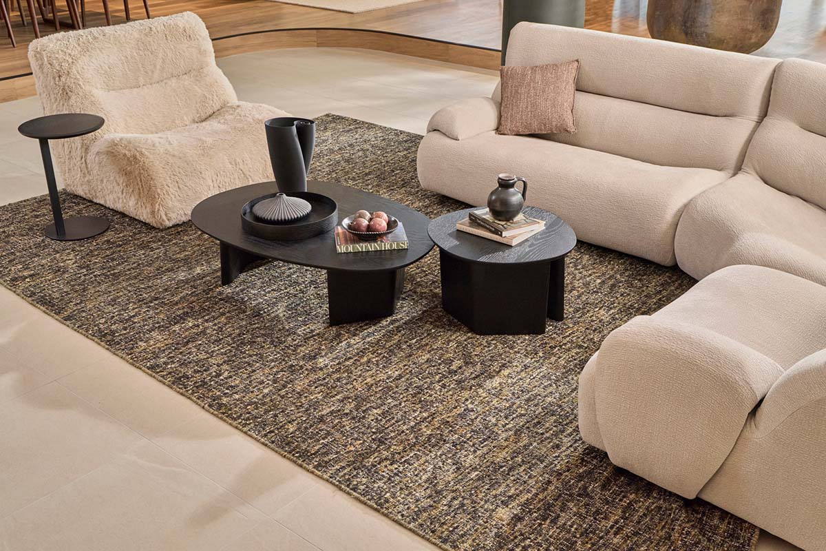 Designed to overhang and cluster in different heights, the Issho tables form one cohesive look when styled together, beautifully completing the centre of a large modular sofa setting.