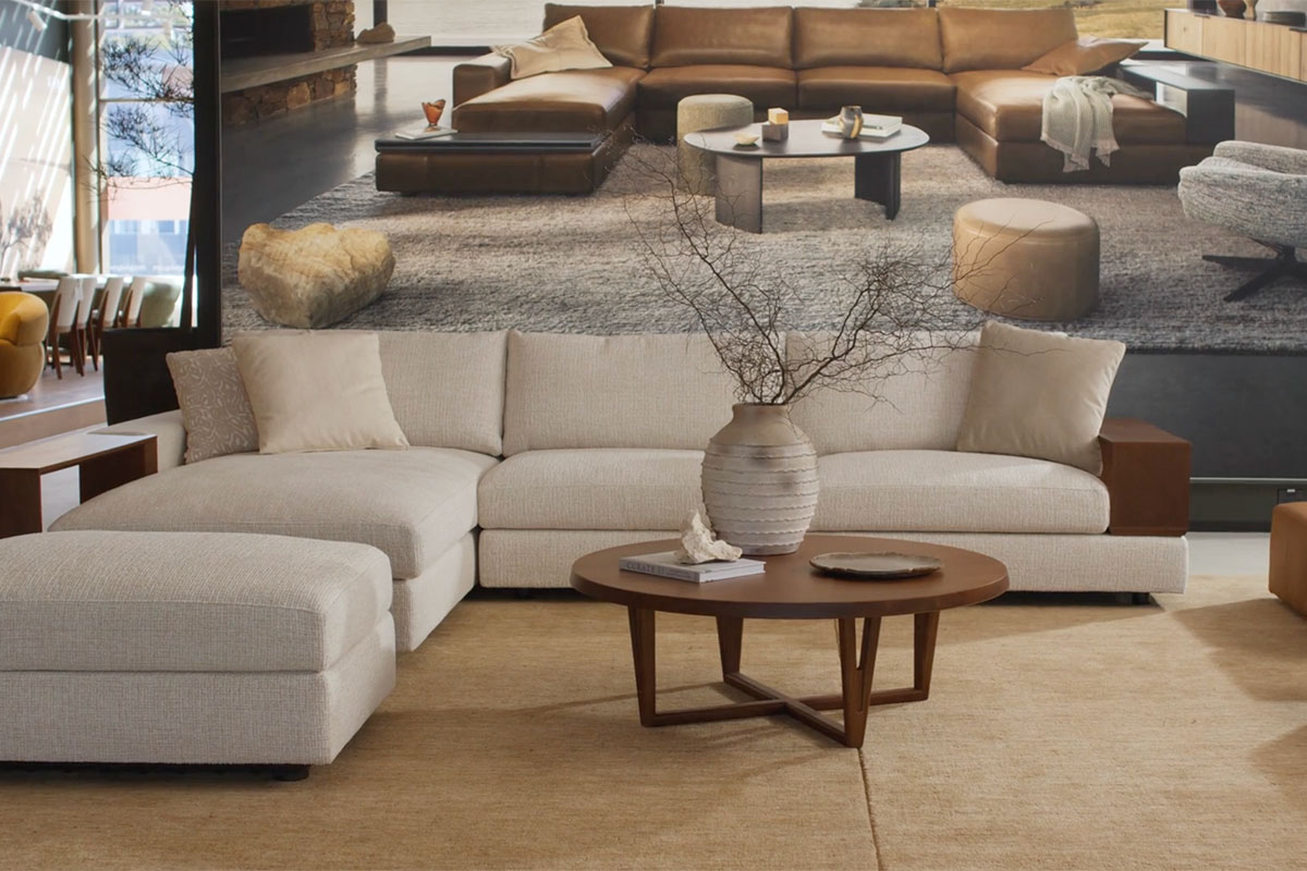 “Jasper’s Whiteley Riverstone finish is an organic weave. I’ve echoed that texture and chalky colour with a sculptural vase and foliage in earthy shades of brown, creating a tonal connection across the sofa and coffee table.”