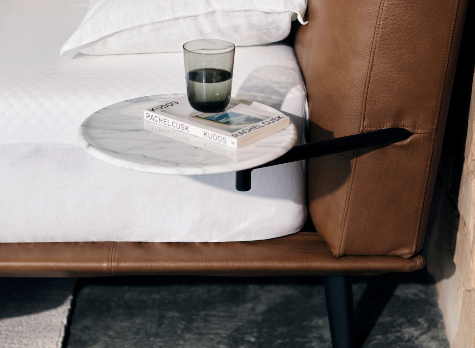 The Neo bed shows how you can make more space for sleep, eliminate clutter and hide cords with integrated smart accessories. Connecting to discreet Smart Pockets, the Lume Light features gesture control and light level memory, while Smart Tables, with optional wireless charging, are ideal for apartment bedrooms where space is at a premium.