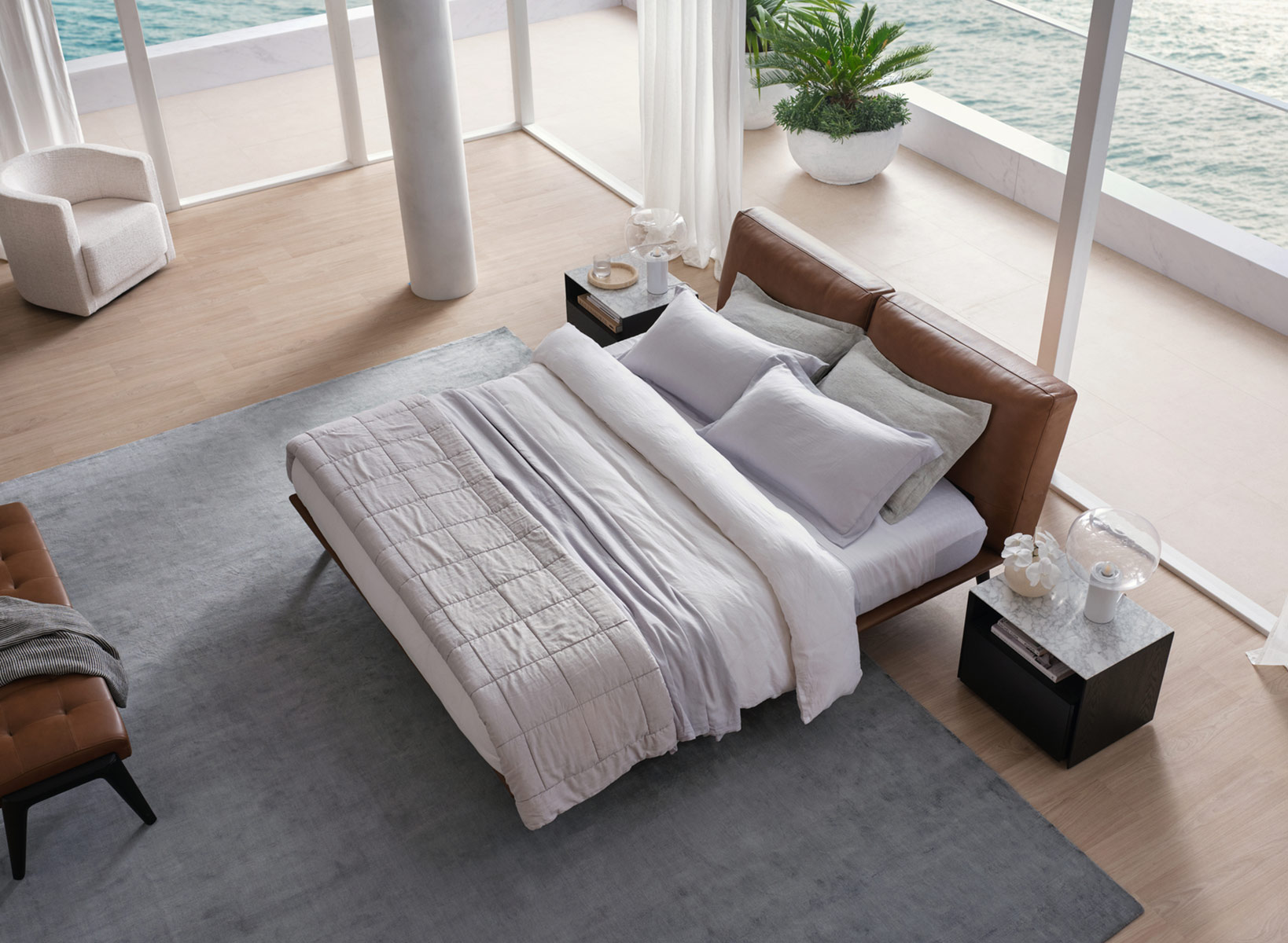 The impeccably tailored bedhead is the perfect backrest for lounging or reading in bed. Rounded edges on the base are a thoughtful design choice, inviting you to move around the space with ease.