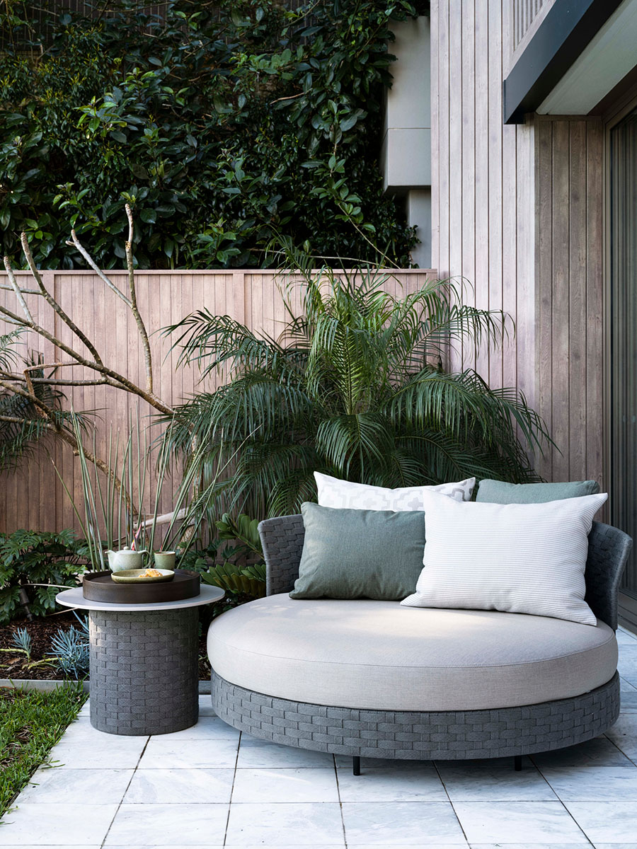 In a small courtyard, a round table helps to optimise the available space. With no hard corners, it creates a smoother flow and removes possible obstacles to traffic moving through.
