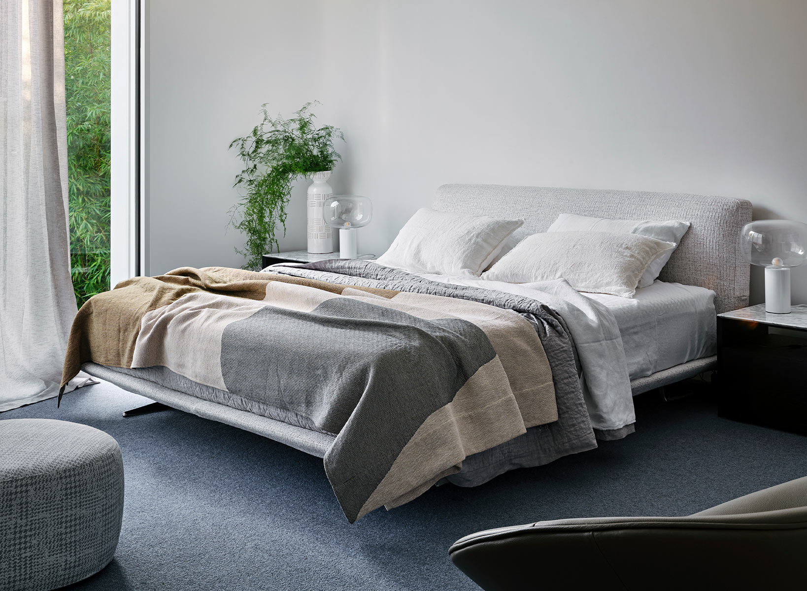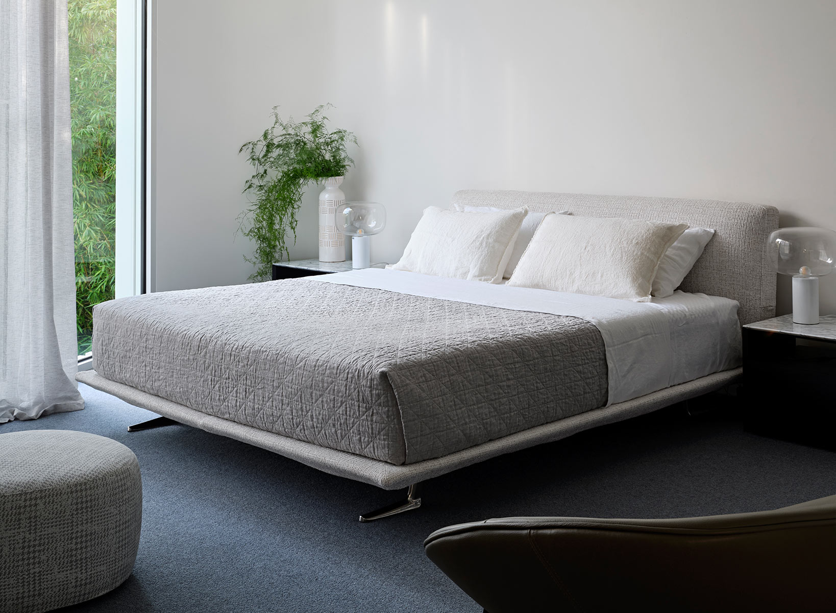 Space permitting, accenting the bedroom with additional elements such as an occasional chair or ottoman will build flexibility within the room. The KING Luna Chair and Crescent Ottoman provide aesthetic charm as well as additional seating for curling up with a good book. Lastly, illumination is key to achieving a cozy and comfortable bedroom space. A table lamp like the handblown glass KING Pallino Table Lamp adds sophistication. Perfect for winding down to prepare for deep, restorative sleep, ready for the following day ahead.