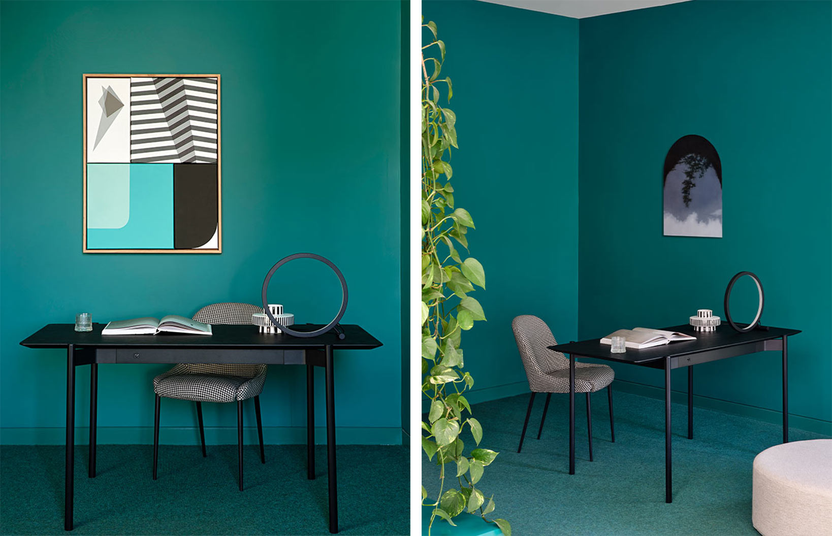 Featuring the Eto Desk in Onyx, Quay Chair in James Dunlop Heritage Formal, Eye Table Lamp in Onyx and Bongo Ottoman Large in Pisa Sago.