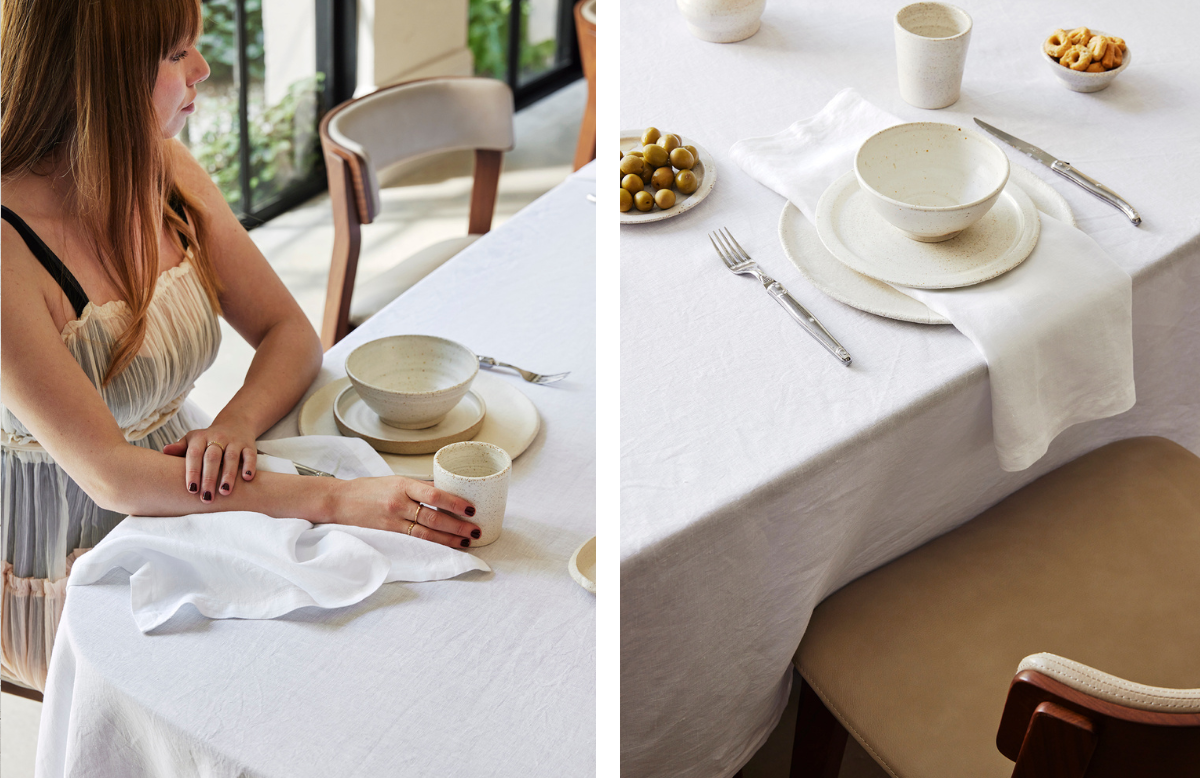The eye needs to travel! In styling, in art, in photoshoots, in your home. Everywhere. Layers and height are essential in creating visual depth and interest. When it comes to dining one needs to balance softness and hardness, low and high, and light and darkness. For me the willing formula for a dining setting is soft textiles (CULTIVER linen of course), handmade ceramics, delicate glassware and considered touches of metal.