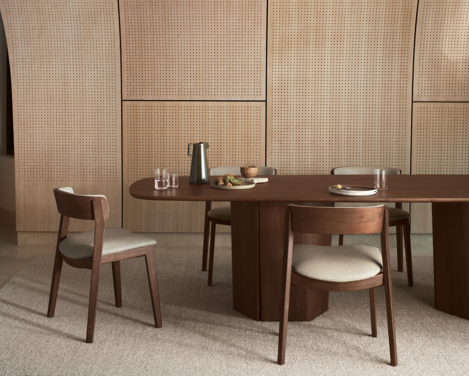 The Issho Dining Table is a statement in and of itself, with a sculptural form that celebrates the beauty of organic curves. Available in a round or curved rectangular shape, the curved base pillars can be rearranged in an open or plinth style to suit your taste. The option for a built-in lazy susan adds to the functionality of the table. Pair with the elegant curves of the Amara Dining Chairs.