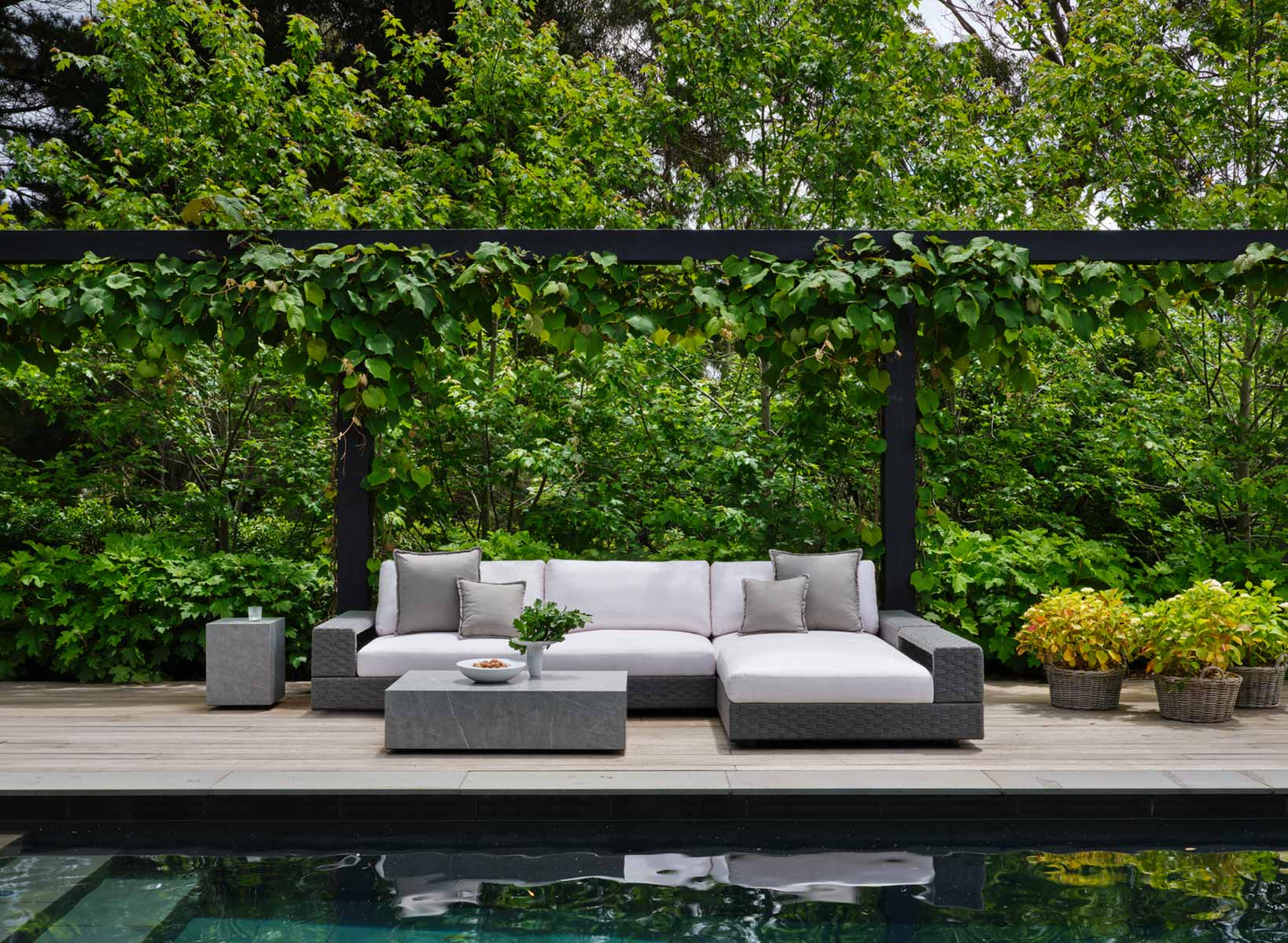 As the sun begins to slip away, a cozy, private sanctuary is an ideal way to savour those calm, balmy evenings. Whether it’s relaxing around a firepit as the day cools or lounging with an afternoon aperitif in the sun, seating should emulate where you seek to wind down indoors. A modular sofa, particularly one with storage under the seats, offers flexibility and practicality.