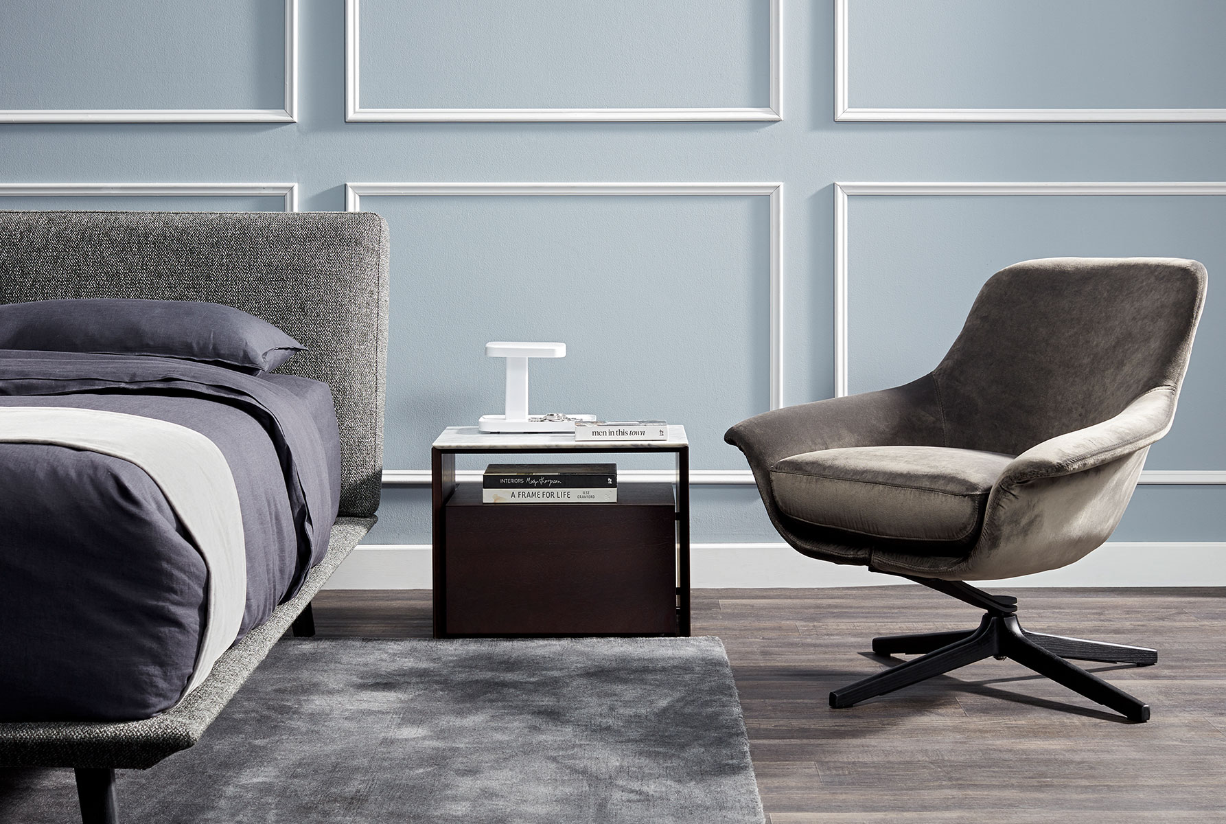 This look features the slimline Neo bed, with its sleek, simple and low-to-the-ground design. “I kept things tonal, using variants of grey for this bedroom (with my bed linen and upholstery choices),” says Grant. “Grey is a modern favourite and works with everything and in just about any space - the perfect foundation shade. When it came to decorating, I chose more masculine undertones and kept the styling to a minimum. Sometimes the interiors world has a tendency to be a little too feminine! I kept things neat, clean and understated for a classic and timeless style.”