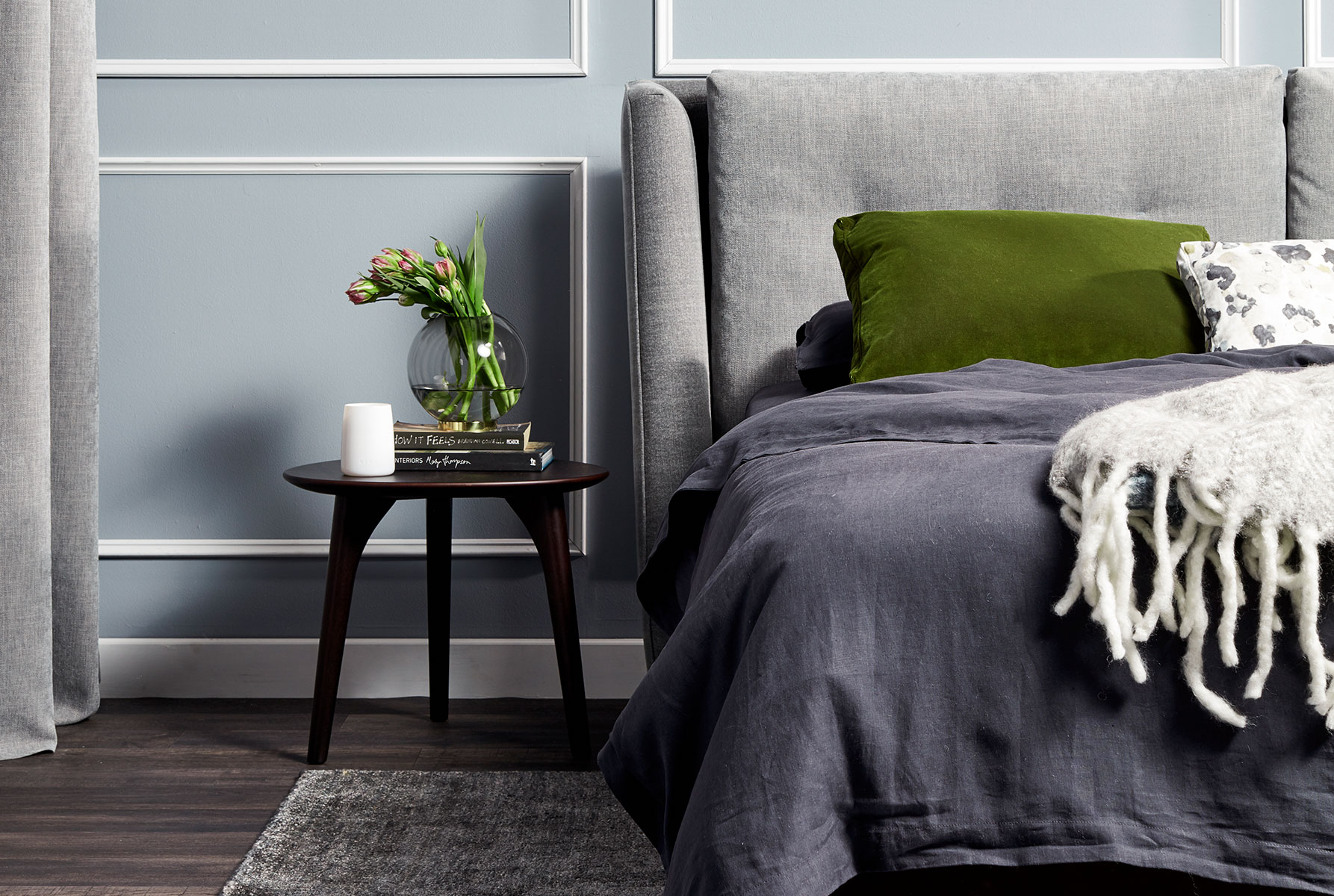 “In this bedroom, we were inspired by New York, but designed an atmosphere that evoked style hubs such as London, Paris or LA as well,” says Grant. “I wanted to create a sense of urban chic, injecting colour with artwork and occasional furniture for a lived-in luxe look. Everyone wants a super luxe bedroom so we used the dramatic wingback Symphony bed headboard (how great is this upholstered bed head – it’s a real statement piece!). And I fell in love with the green velvet in the occasional chair and cushions too.”