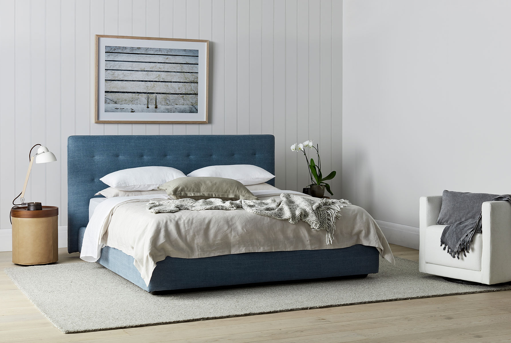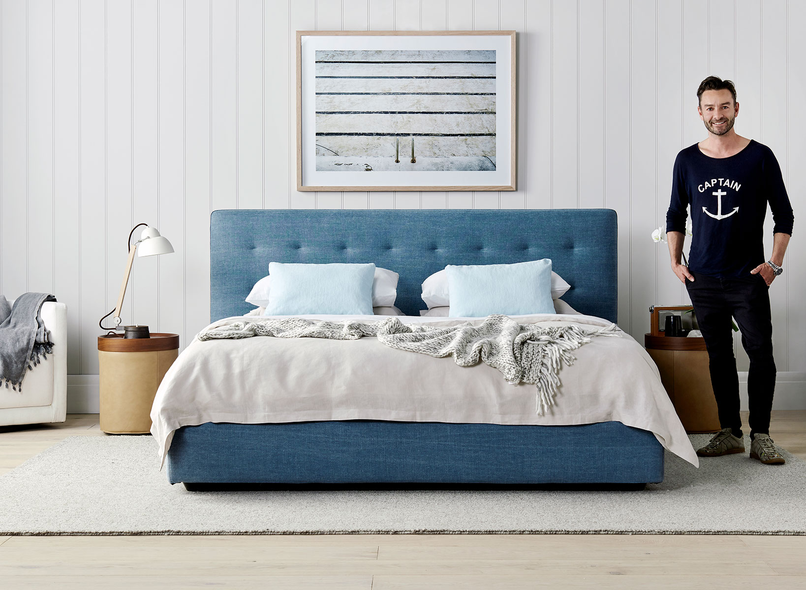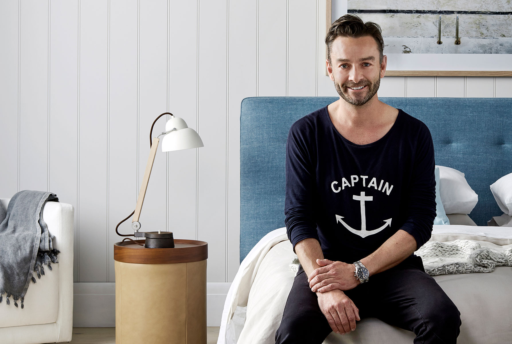 Grant is well known for his relaxed coastal style and this bedroom reflects his aesthetic. “No need to guess my inspiration… Bondi is my happy place!” he says, laughing. “This room is just like me, never far from the sea, lots of crisp white, with tan leather, soft blues and subtle neutrals. Consider this chambray Serenade quilted bed head to be like your favourite pair of jeans – it will go with anything. I use it as a neutral and feel it can work with a variety of looks, adding a subtle sense of sophistication and casual style. “