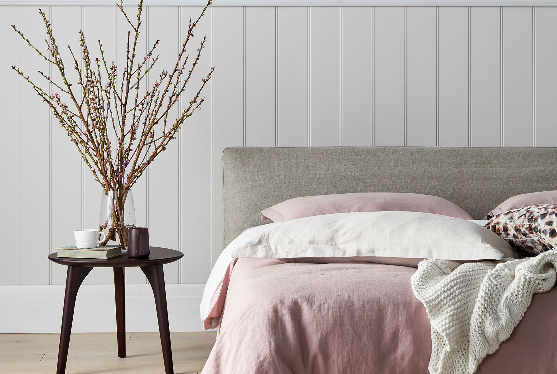 “For this bedroom we injected a contemporary country feel with some pretty pinks, complemented by the beautiful Musk linen quilt,” says Grant. “Featuring the Promenade Storage Bed, I love the natural linen fabric we used for upholstery. (I think this is my favourite bed.) The no-fuss design is simple and nice and low to the ground. The look is designed to evoke a feeling of escape, taking us away from the city for a weekend to create the perfect country getaway. Total relaxation.”