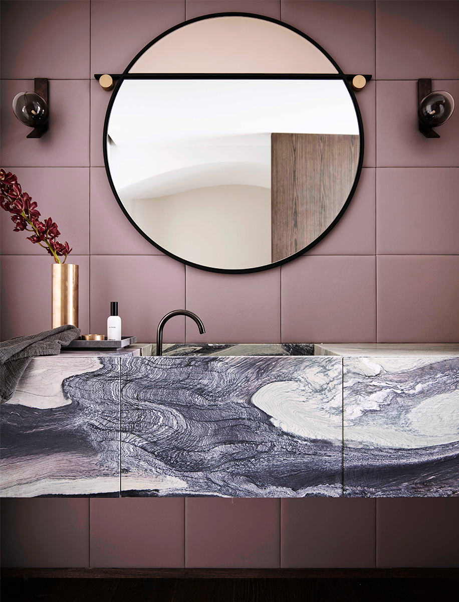 This exquisite jewel of a powder room is located near the entry on the ground floor of a newly built Sydney home. "It's an almost-hidden gem as it is accessed by a door concealed within joinery," says Alexandra. It's layered with a delicious mix of luxury finishes. Central to the scheme is a feature slab of Cippolano marble, which forms the streamlined cantilevered vanity that spans the width of the space. Leather wall tiles in a matt, musky pink create a soft backdrop to the stone, and help to amplify the sense of glamour.