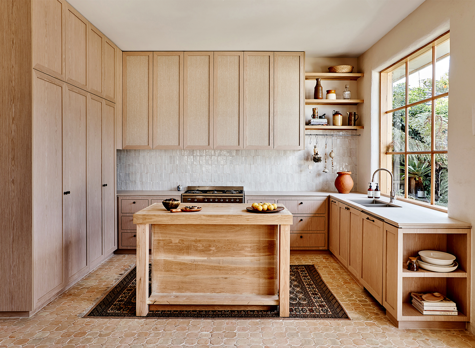 Interior designer Georgia made it her mission to source bespoke and tactile pieces for her own kitchen. Stylistically, it represents a cultural mix of her favourite places on earth. "It's Mediterranean meets Middle Eastern meets modern," she says. Functionality is foremost, with a work triangle that delivers garden views from the kitchen sink. Ample storage was non-negotiable; the timber cabinetry is inlaid with grasscloth "to create warmth and depth" says Georgia.