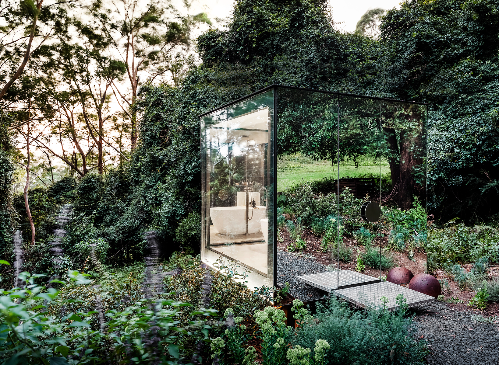 Madeleine and Kevin created a luxurious bathroom that sits within a mirrored cube, situated down a plant-lined path from a cabin – a triumphant reimagining of the Aussie outhouse. "The concept was to separate the bathroom from the cabin and to give users the sense of being outdoors or camping," says Madeleine.