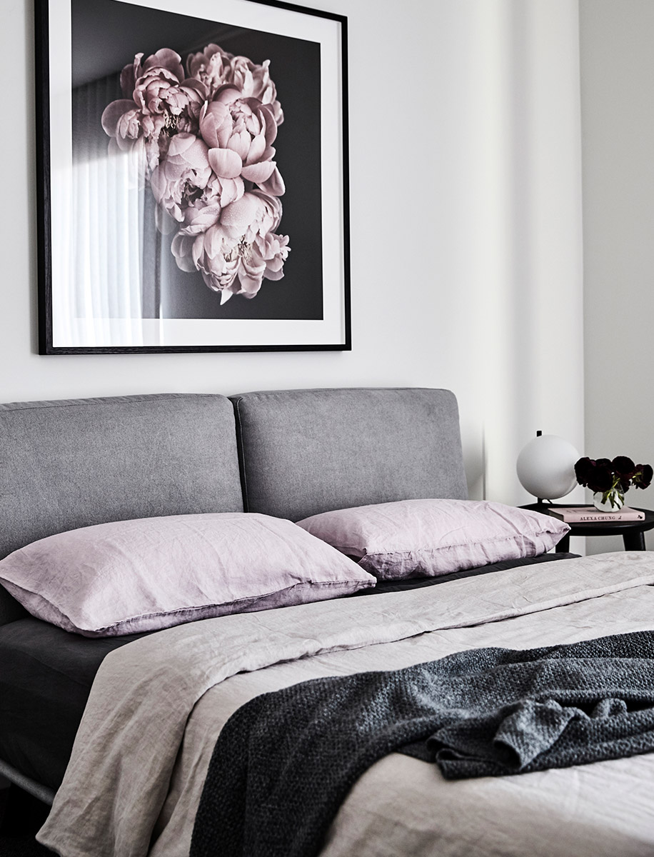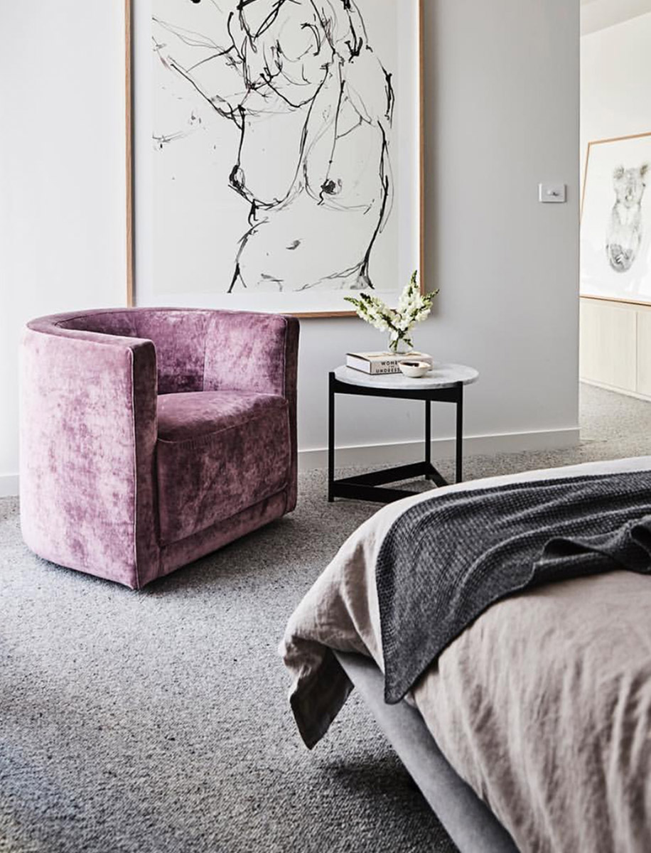The thoughtfully considered guest bedroom features the Neo Bed in King Luxe fabric, with Venus side tables perched on either side. The romantic muted pinks are carried through the room from the artwork and linen to the plush Oliver Tub Chair in Boho Velvet.