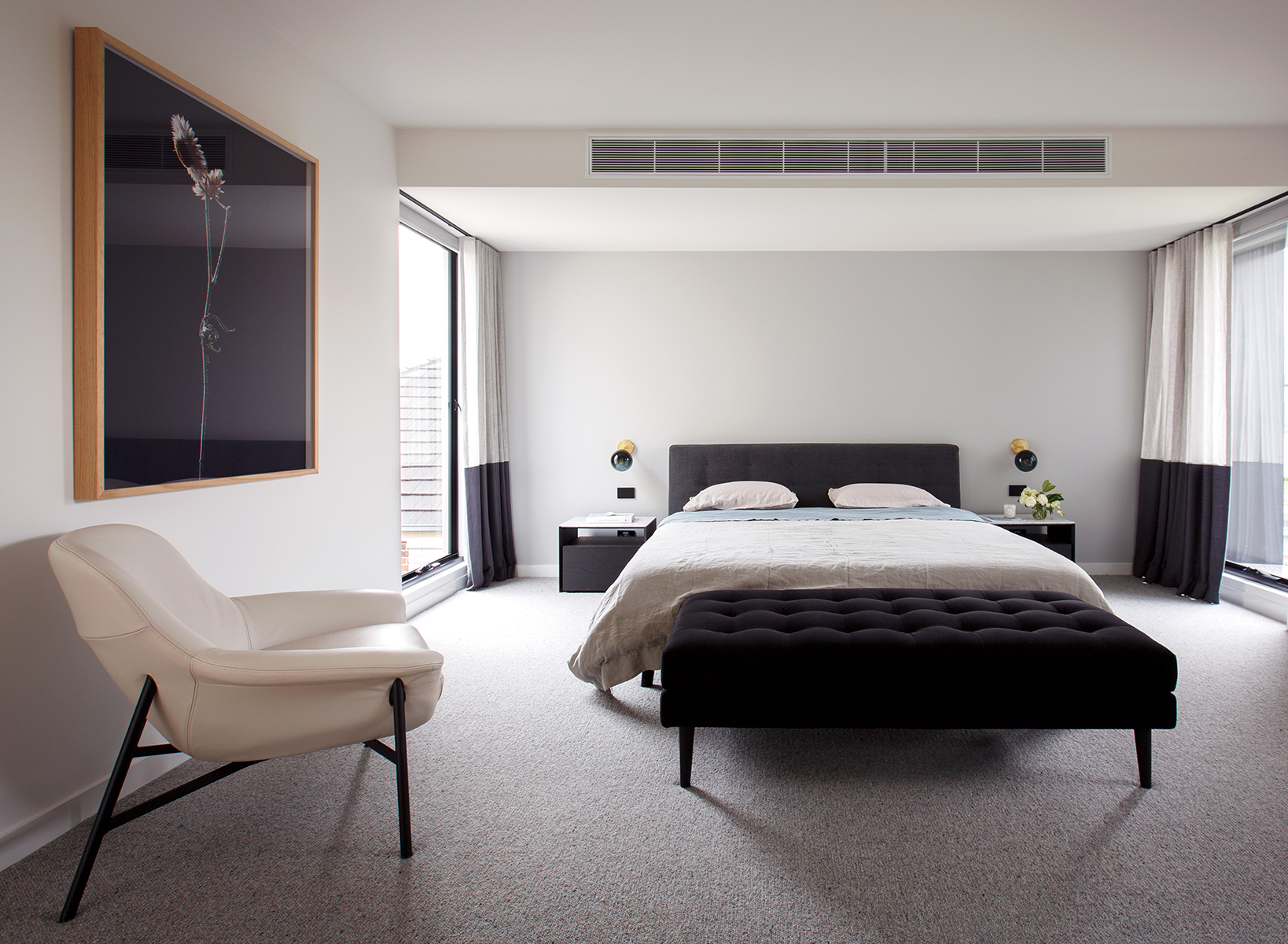 Stepping into the master bedroom, one is almost overwhelmed by the room’s opulence. Lavish textures coupled with a chic, neutral palette delivers luxe hotel-room vibes. Thoughtful design sees the bedroom flow into the luxurious ensuite and expansive walk-in wardrobe, creating an organic, connected, yet open space. King Living’s Encore Bed in Embrace fabric is contrasted with the elegant low-back Seymour chair in sumptuous ‘Silk’ Prestige leather. The play on textures provides a wonderful tactile element.