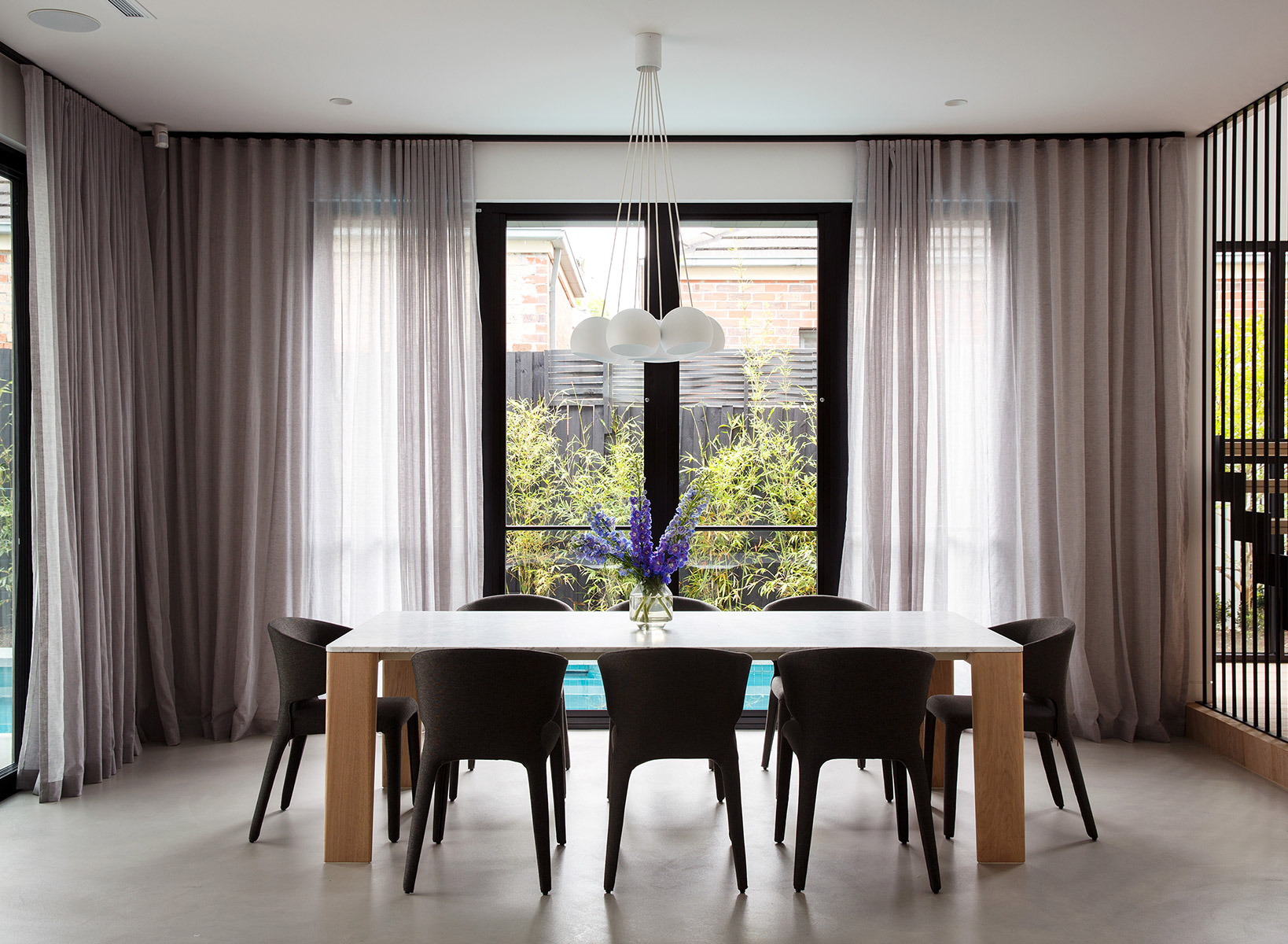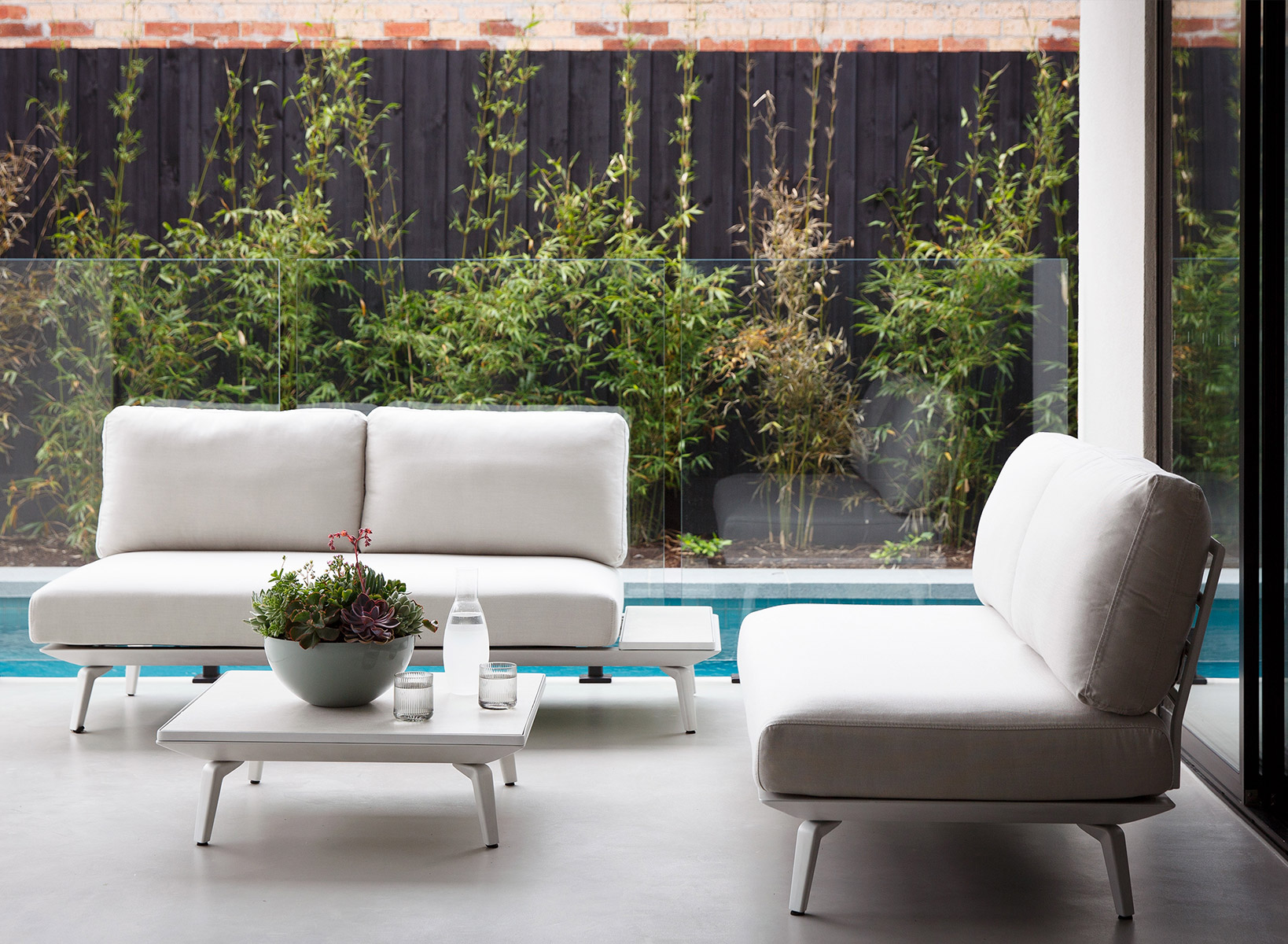 Aimee and Frank’s state-of-the-art kitchen sweeps into the dining area, which features the sleek marble-topped Former® Keel Dining Table. Bi-fold doors open to the lap pool and outside entertaining area, where the graceful King Cove setting in Cabana Breeze with ceramic accessories makes a statement. "We wanted to create an outdoor area that was very much connected to the house".