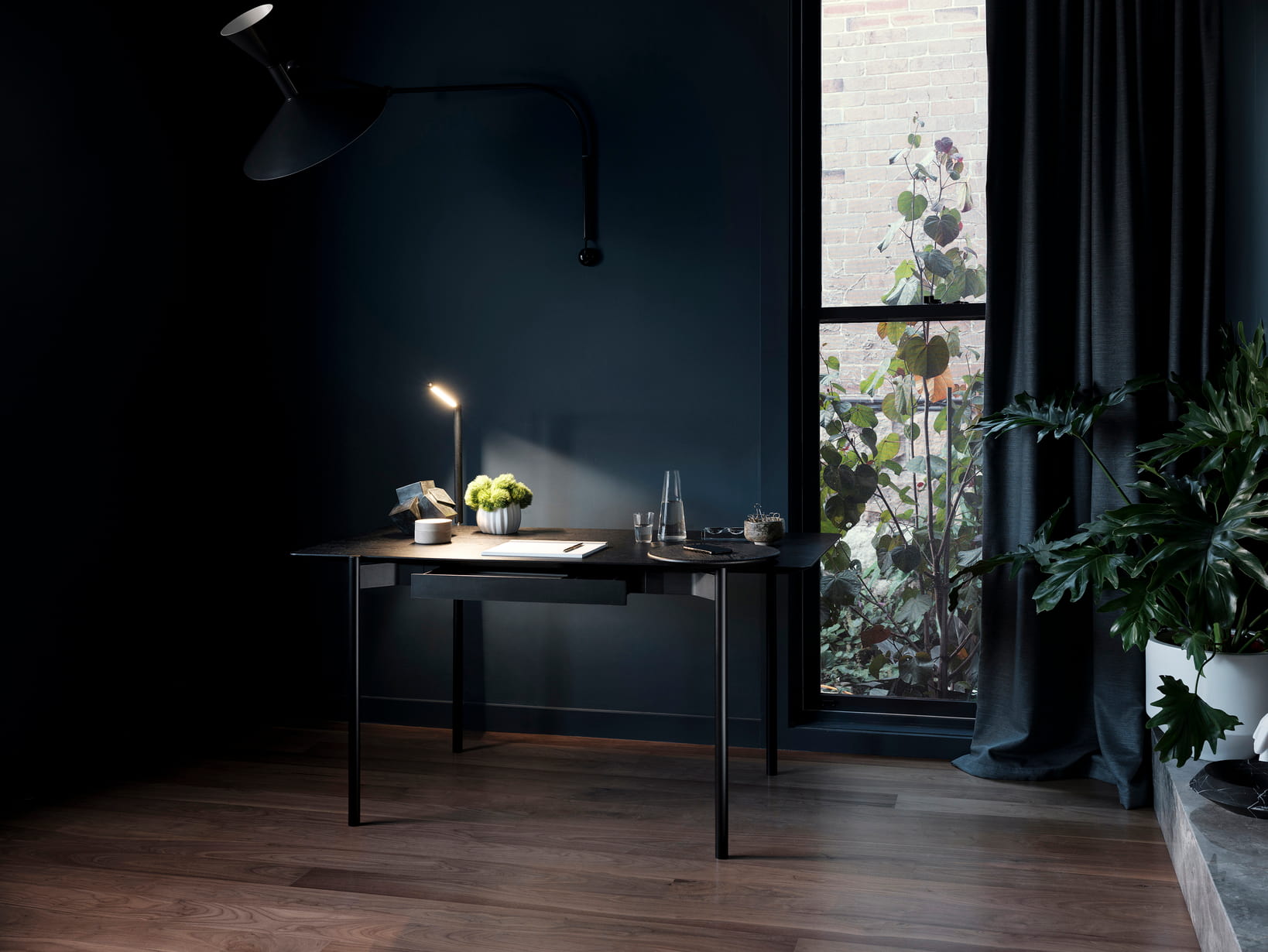 The Eto desk featured in Onyx seamlessly integrates power, wireless charging and lighting.