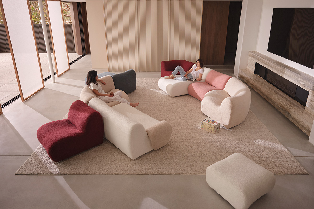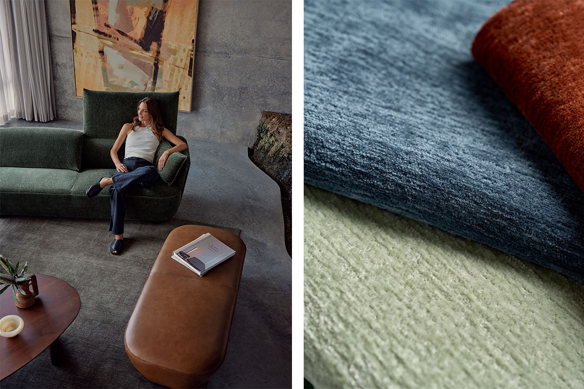 The Aura Sofa is an ideal to way to accomplish this trend. Influenced by the form of floating islands, the curved form is beautiful from every angle. Combine with rounded side tables, like the Myco Side Table and pair with the Aura Ottoman for a cohesive aesthetic.