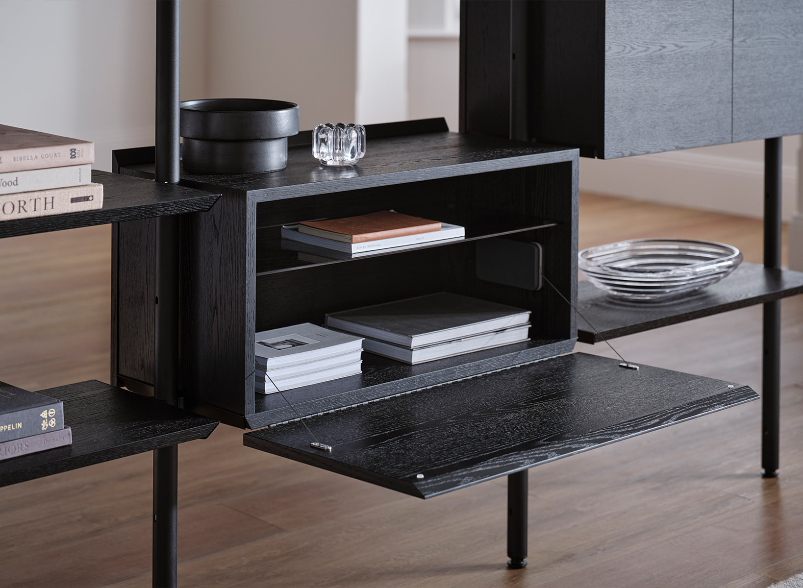"We wanted the timber to be the hero of the design, bringing warmth to the black powder-coated metal components. To achieve this, we decided on a very clean finish free of any ornamentation, so no handles or hardware other than what was entirely necessary."