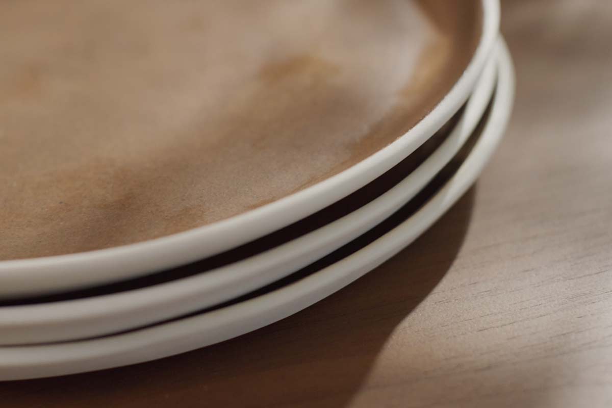 “We then hand cut all our shapes using a template so when you get your dinner plates, they stack nicely, and they're roughly the same size. Once the clay is firm enough, we hand shape the rims or use moulds we have made in house.”