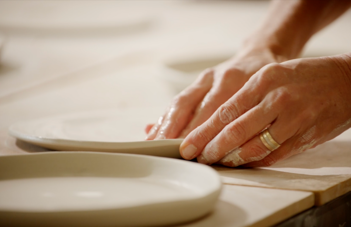 “We use two different techniques. One is called slab rolling, where the clay goes through a machine, like a big pasta roller, to create a large flat, beautifully compressed slab.” Kim explains.