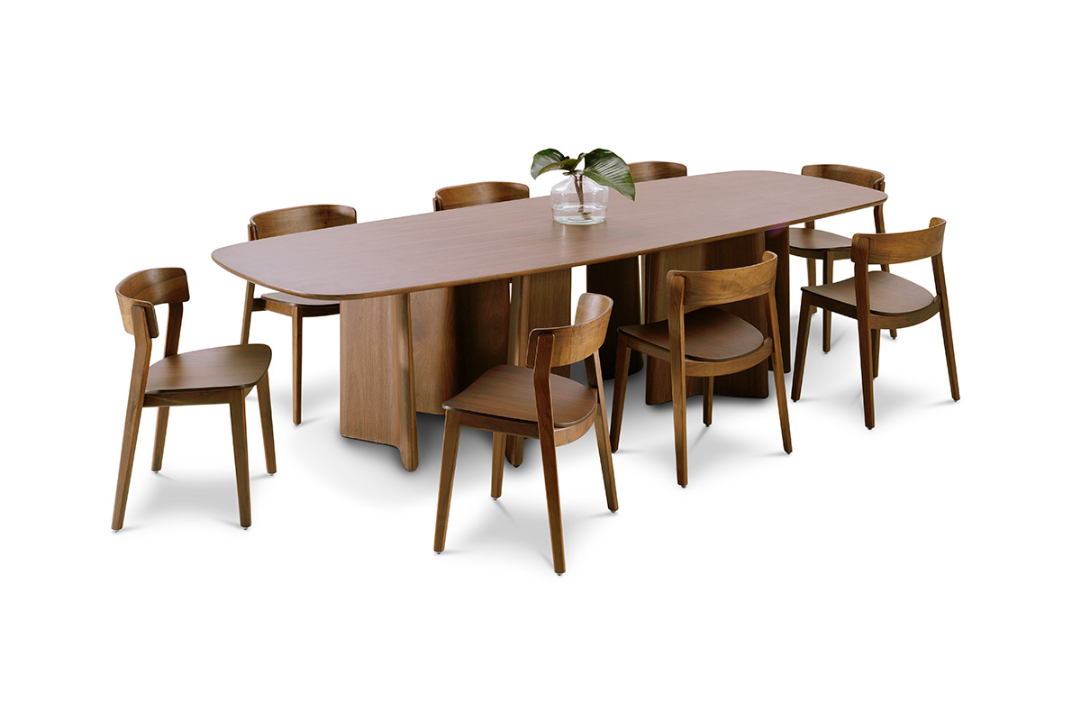 “The Issho Oval Dining Table, with its sculptural base and softly rounded edges, works beautifully with the Amara Dining Chairs, where steam bent timber forms the precise curve of the backrest for comfort.”