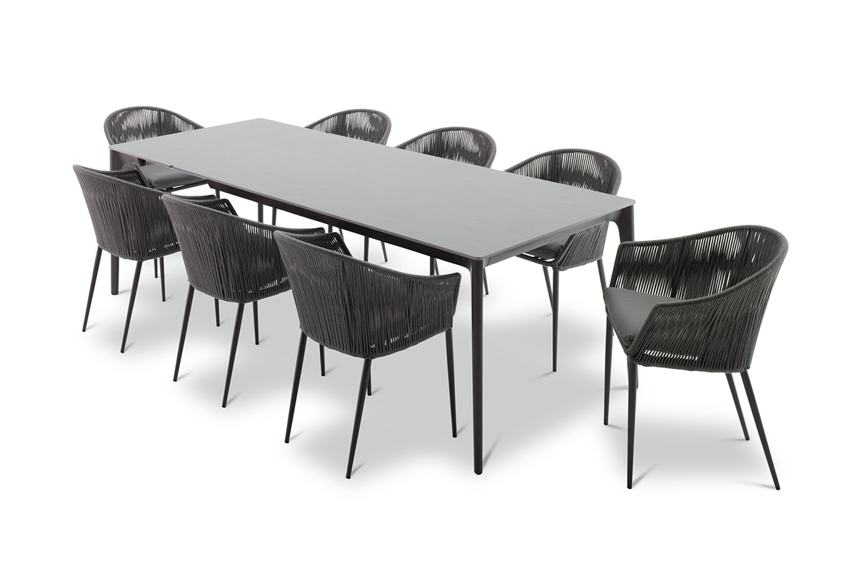 Paired with the Quay Ceramic Dining Table, engineered to withstand the weather while retaining the look of organic stone, this setting balances comfort and durability.
