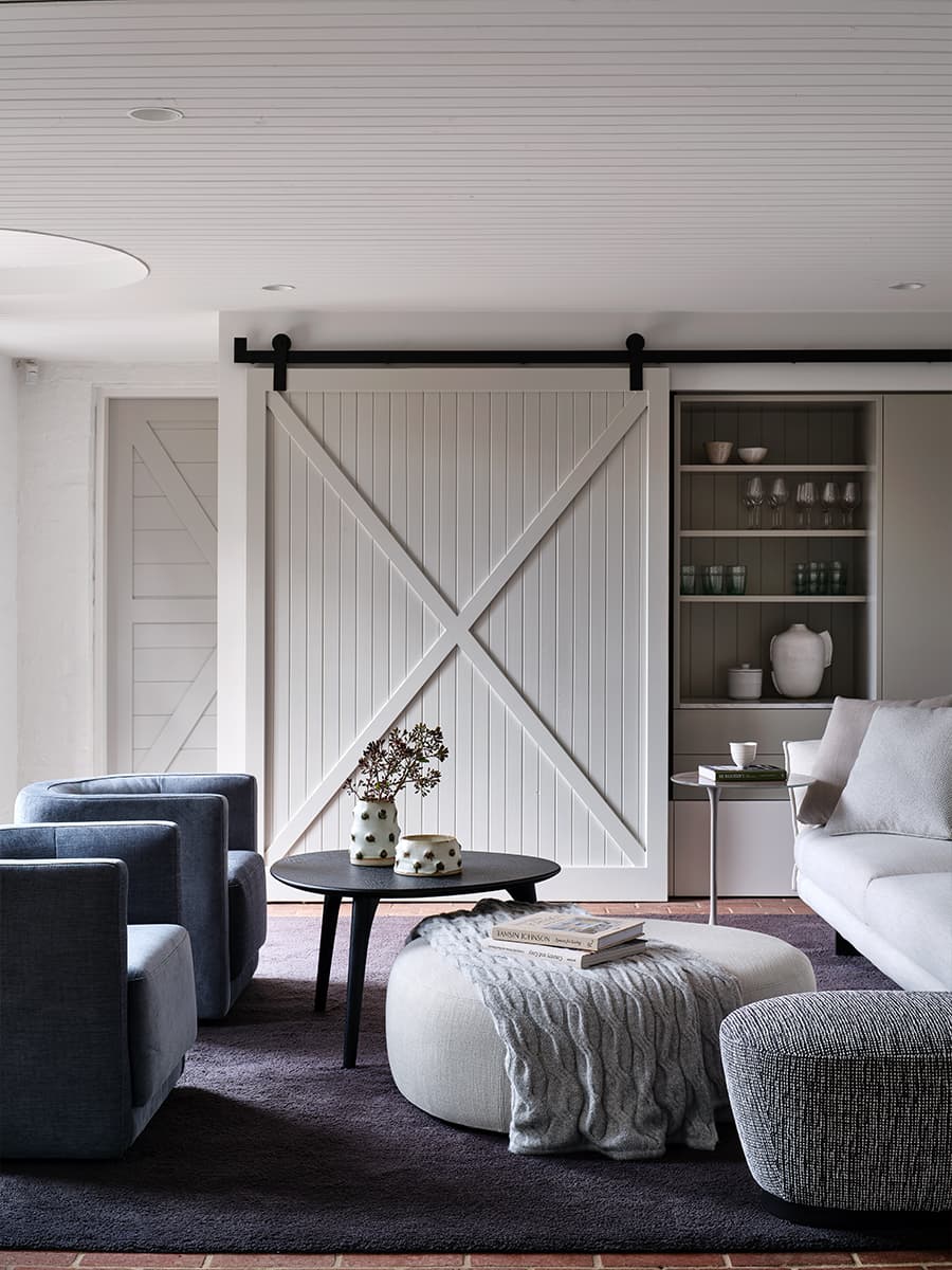 A soft-hued colour scheme enhances space in the living area. As does the large timber slider to neatly conceal unused items. Positioning furniture within the centre of the room optimises square footage while ensuring traffic moves around the perimeter – not through the entertaining zone.