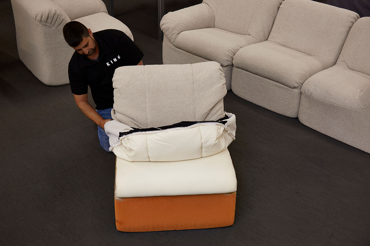 The journey to bring the sofa back to life started at the King Living Design and Support Centre, where a team of skilled craftspeople handled the restoration with the care and precision. The process required expert attention from four key specialists, each playing an essential role in restoring the sofa to its former glory.
