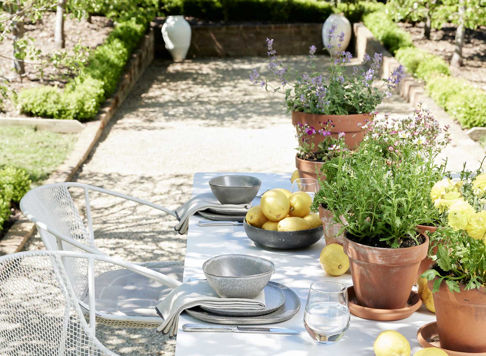 “It goes back to the space and the concept of what you’re trying to create,” he says. “I love the trees on either side and wanted the earthy and organic feel. That’s why I chose the terracotta pots and the mismatching perennials, lavender and rosemary. The scattering of lemons is to introduce the idea that the table was shot in the country.”