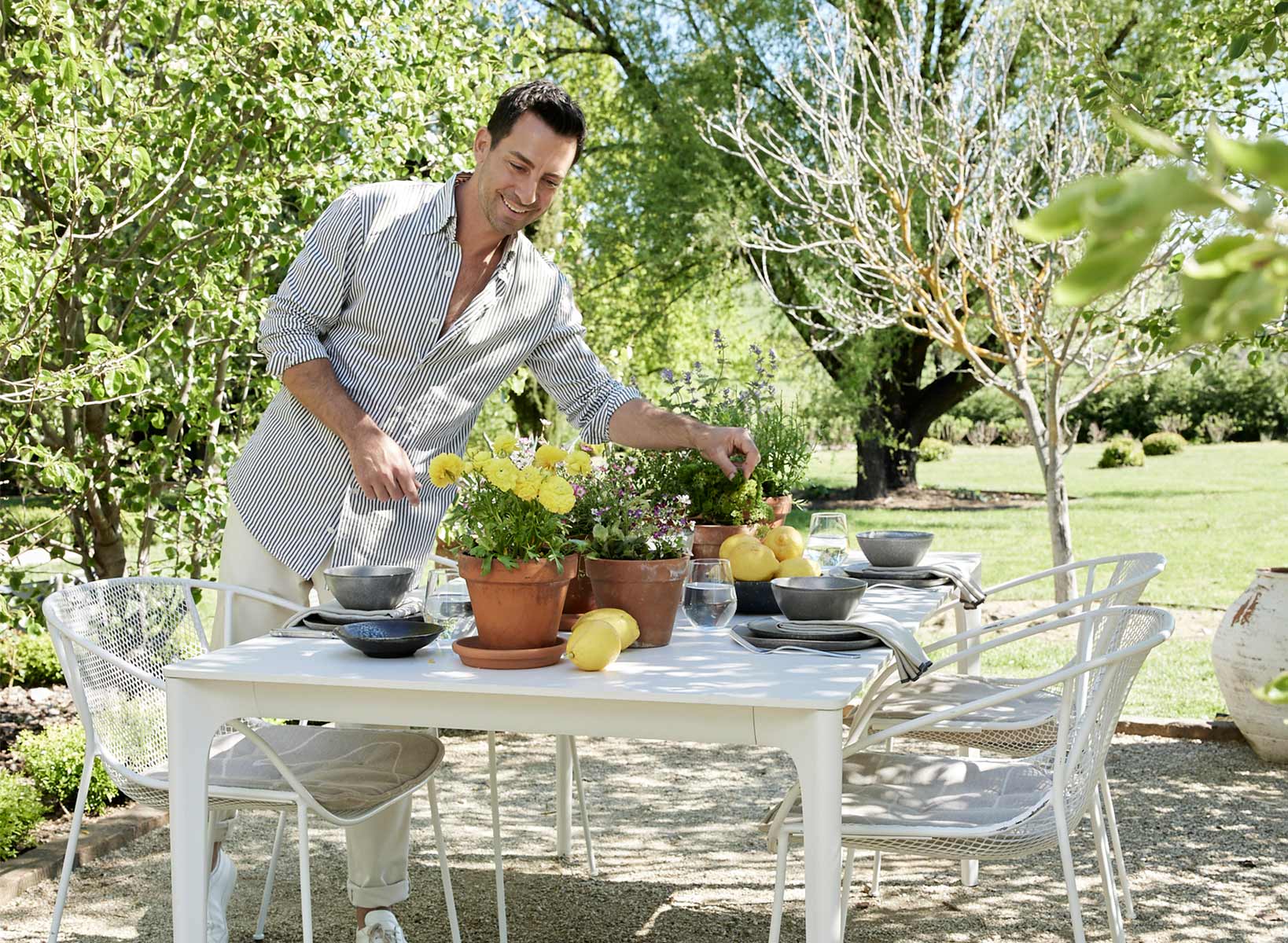 “The white Luna Outdoor Dining Chair was a great option along with the natural, organic graphic of the Oceania Outdoor Utopia seat covers,” he explains. “From there you can start to build and layer. I then had the terracotta and a bit of yellow with the lemons and the ranunculus in those potted plants.”