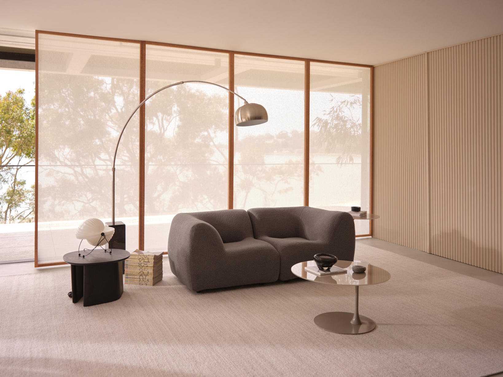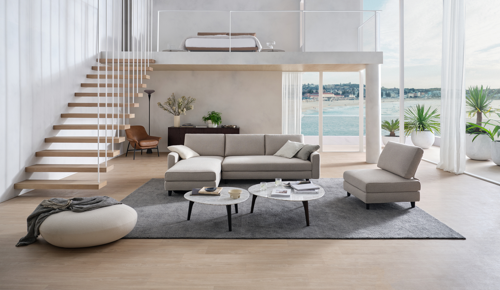 “By layering soft creams, beiges, and greys in a space with natural light, you create a timeless design that feels connected to its surroundings. Adding dark accents, like side tables or decor, keeps the look balanced and sophisticated,” says Alinta.