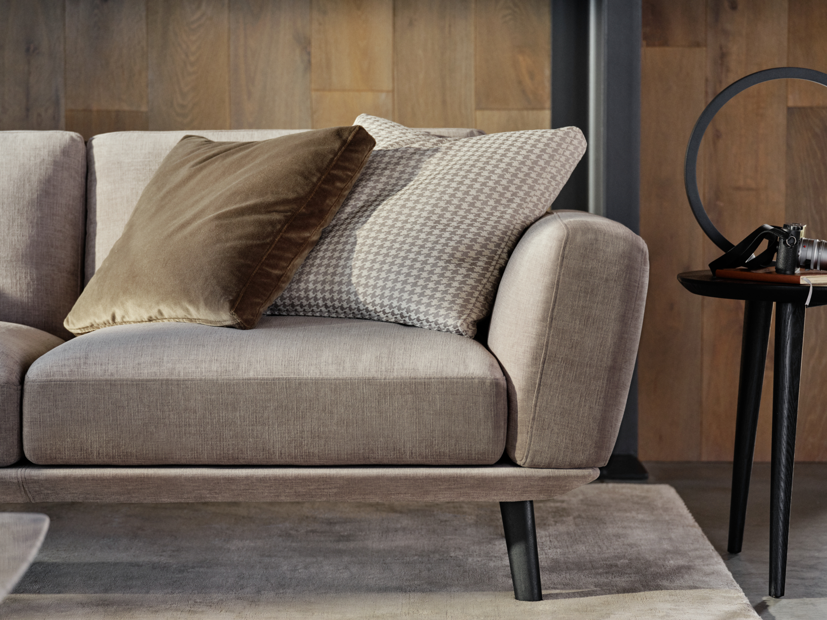 If you want to create a warm and inviting space, pair a grey sofa, like the Neo Sofa in Club Sterling fabric with layered cushions in varying textures. In this look, the soft velvet cushion adds richness and warmth, while the subtle houndstooth pattern brings visual interest and a touch of sophistication.