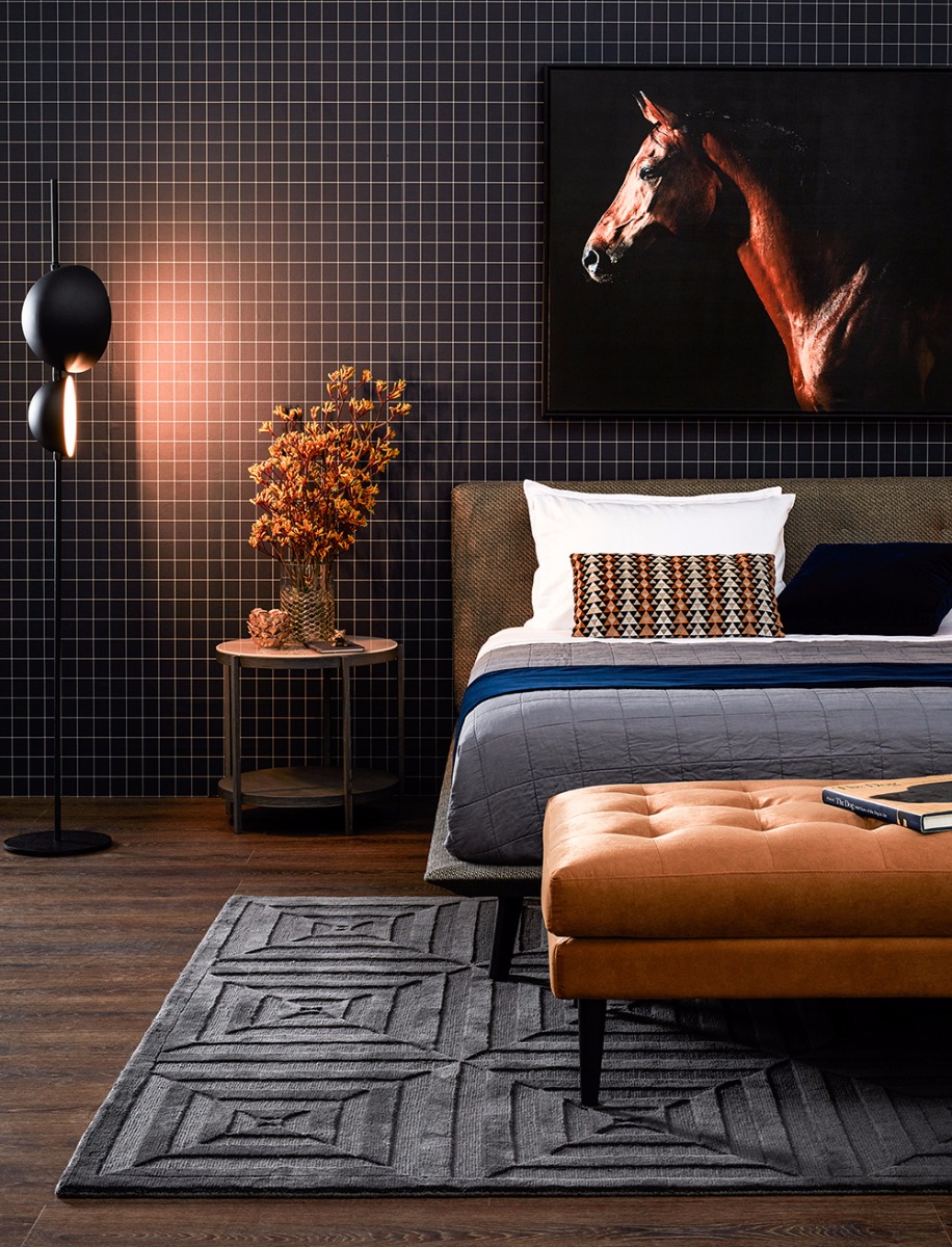 The leg on the Encore bed is slightly curved in cross section and feels very much like Danish mid-century pieces or the classic Featherstone Australian pieces. That leg started the idea of taking it back to the middle of last century and playing with it in a sophisticated way, feeling like a trip into a bedroom room from a penthouse in “Mad Men”. There are a lot of pieces in this room that appeal to me personally, the strong masculine patterns like suiting and textures like velvet and details like buttoning. Horses, architectural flowers and design classic lamps compliment the look and this feels very much like a cool bedroom I’d be at home in.