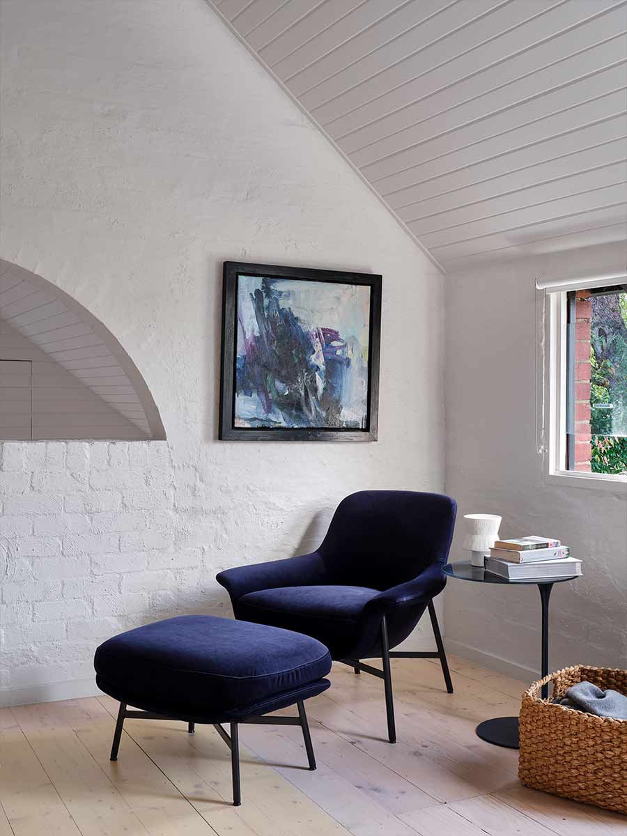 The Seymour Low Back Fixed Chair and Footstool paired with the Apero Side Table (featured in an indigo blue) are a striking contrast – both in colour and texture – with their neutral backdrop.