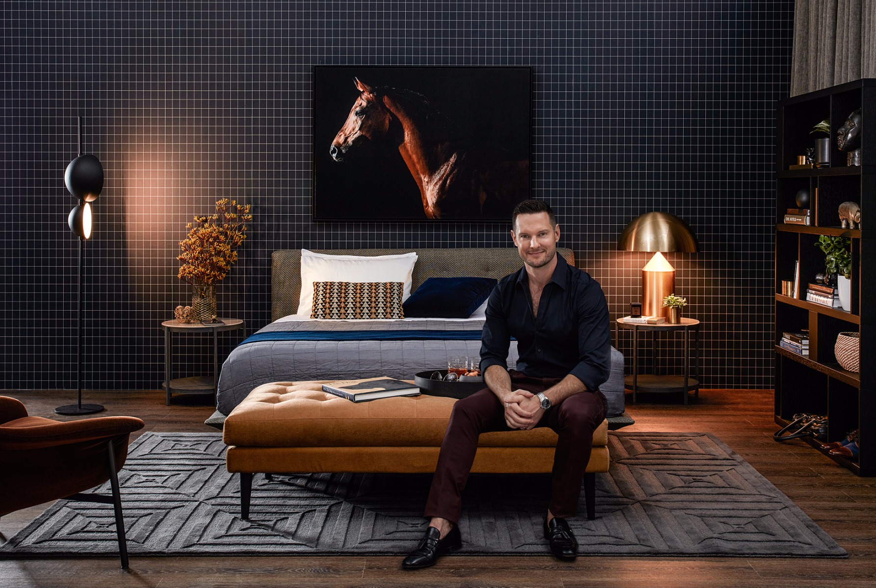 The Farnsworth bedside tables and Amondo bookcase tie-in the timber of the bed base, giving you strong masculine forms and a great place to style and store day to day items.