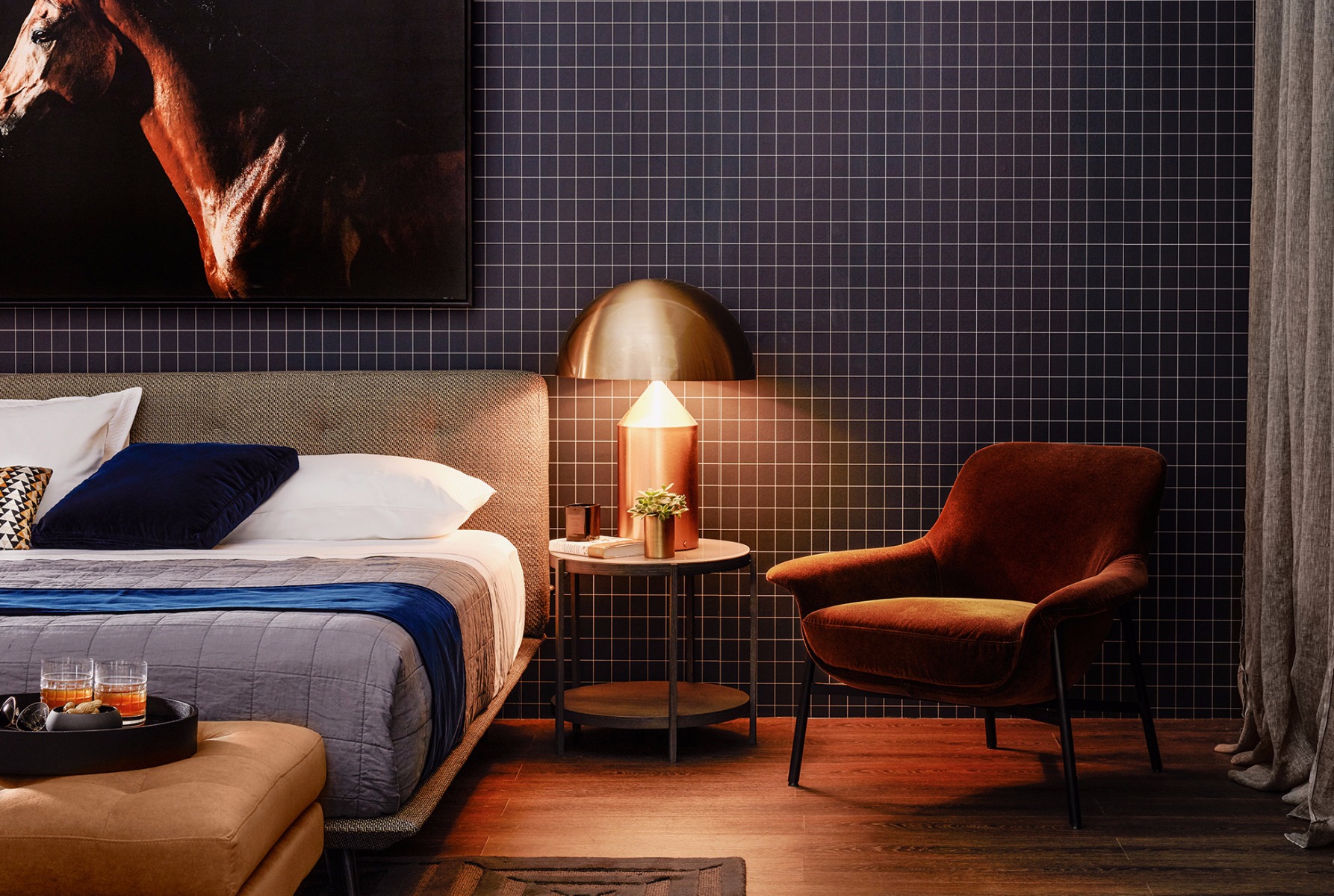 The Lock Jet Black fabric used on the bedhead feels like it could be from a gentlemen’s jacket, the dark charcoal leg akin to suit pants. Luxurious velvets were used to compliment the suiting style, with a chocolate velvet covering the amazing, low backed Seymour chair giving it the sheen of a champion thoroughbred.