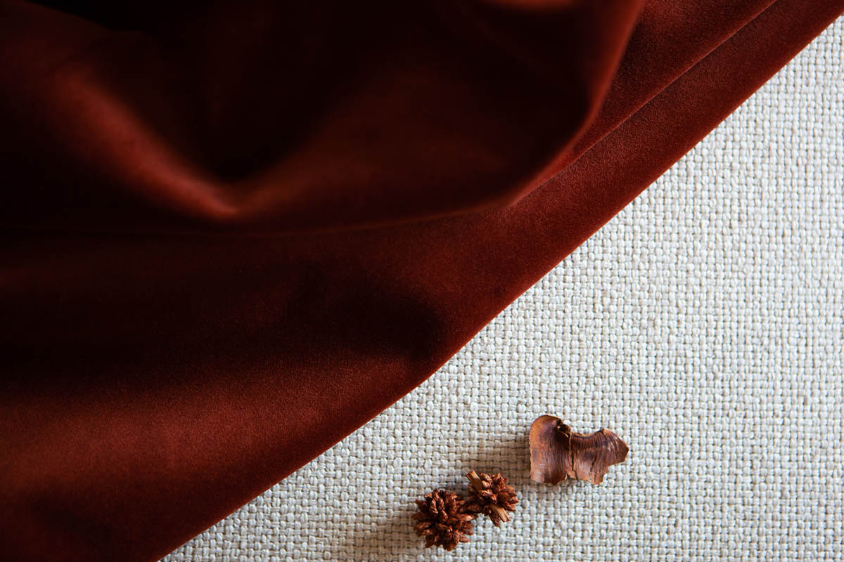 If you’re thinking of smaller pieces, such as armchairs and ottomans, choose a colour that you love to feature as an accent. Below, the rich colour of Preston Velvet in Spice contrasts beautifully with the texture of Hamilton in Belgian Linen.